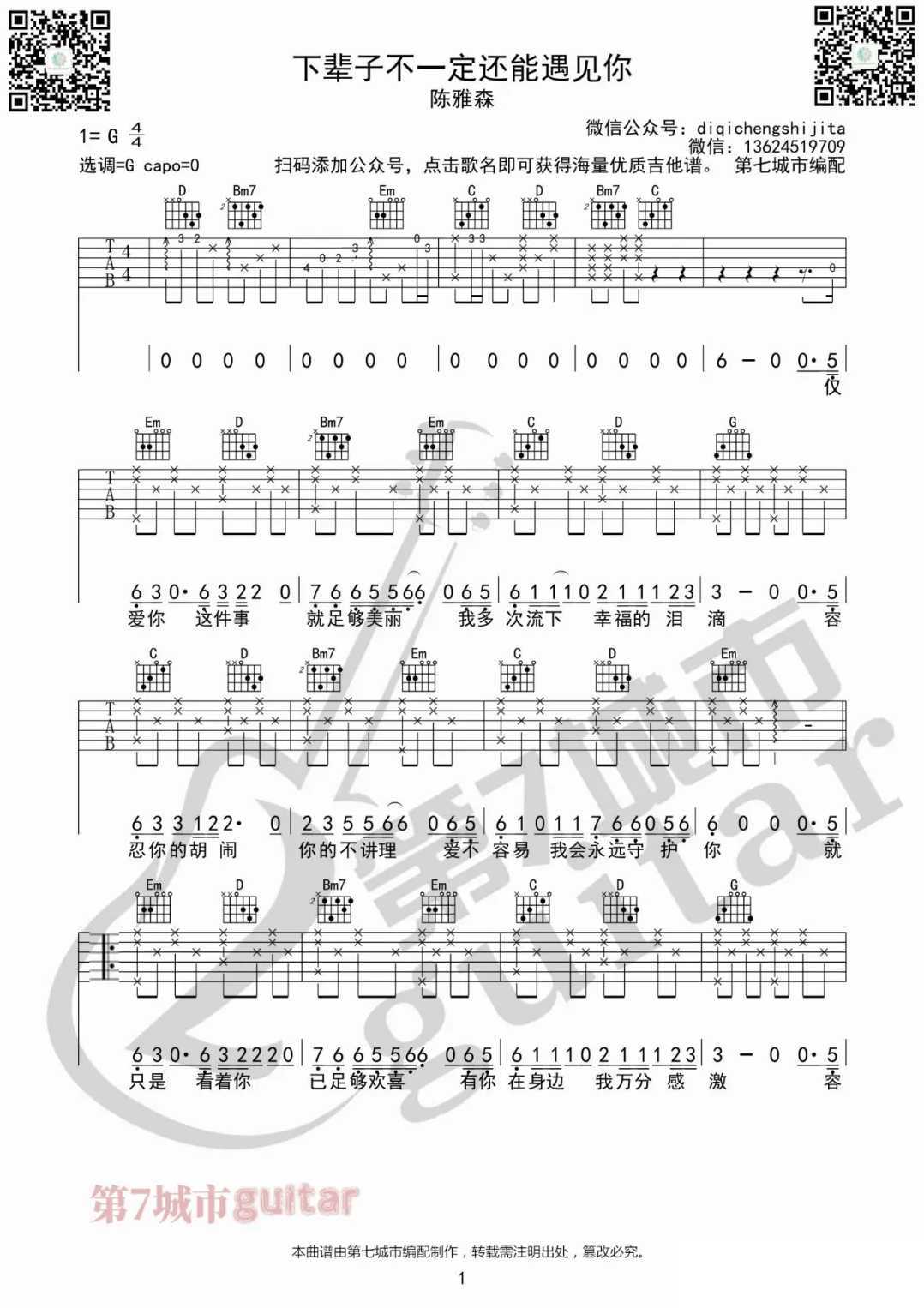 下辈子不一定还能遇见你吉他谱 - 陈雅森 - G调吉他弹唱谱
