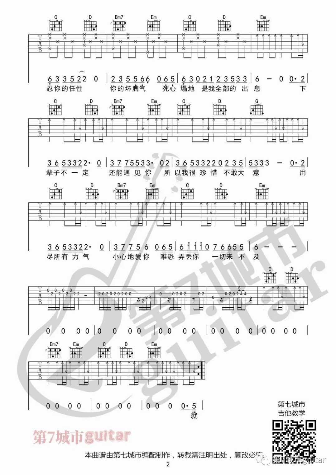 曲谱介绍: 陈雅森演唱的一首歌曲,4/4拍的节奏,这首歌曲的原调为G调,这里曲谱采用了G调指法进行编配,演唱时可不夹变调夹,曲谱由琴谱网更新上传,来源于@第七城市编配出品。陈雅森的音乐总能轻易打动人心,温暖和感动融入到他的歌曲中,让我们看到歌曲背后的故事,或许也是我们自己的故事。