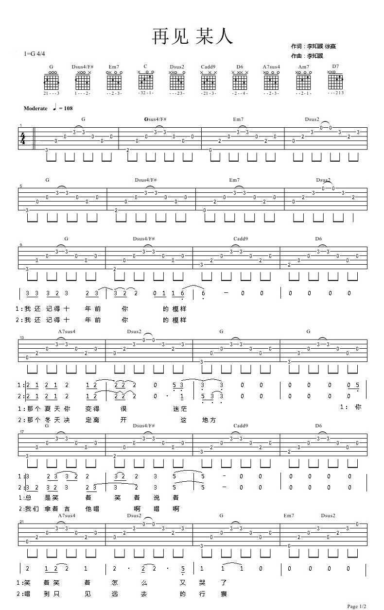 曲谱介绍: 李知蹊演唱的一首歌曲,4/4拍的节奏,这首歌曲的原调为G调,这里曲谱采用了G调指法进行编配,演唱时可不夹变调夹,曲谱由琴谱网更新上传,曲谱来源于网络转载,编配制谱者暂不详。旧人不知近况,新人不知过往。其实真正的送别没有长亭古道,没有劝君更尽一杯酒。就在一个和平时一样的清晨,有些人留在了昨天。