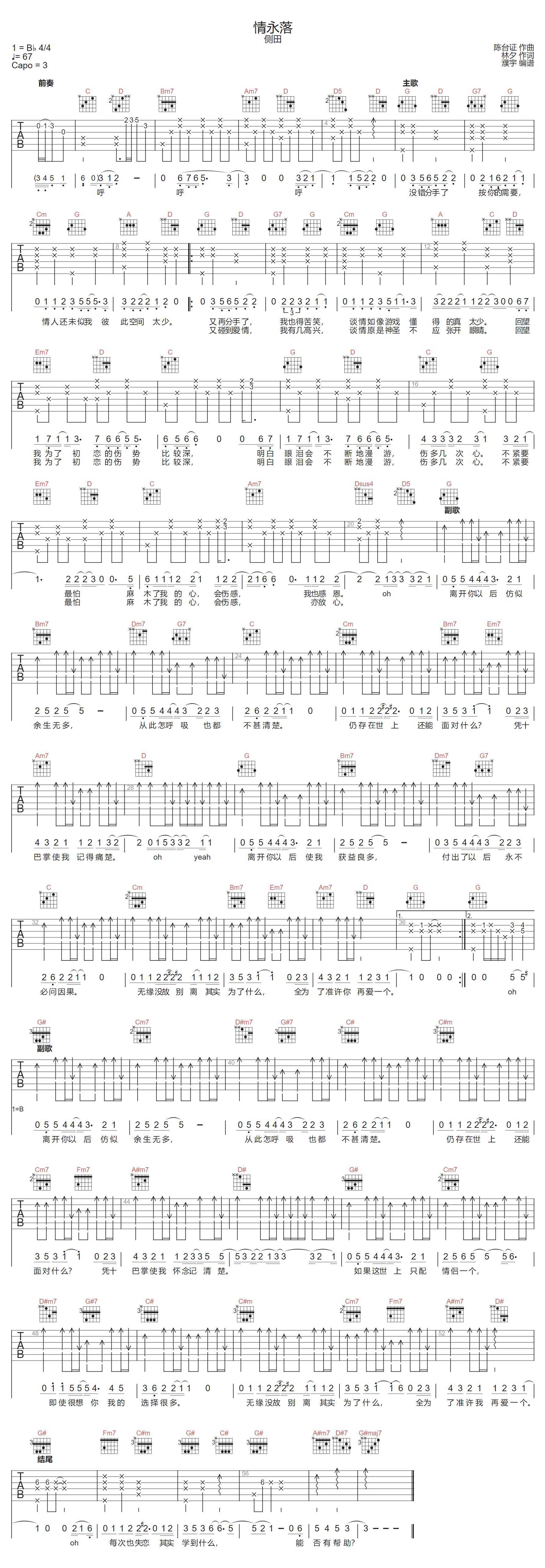 曲谱介绍: 侧田演唱的一首歌曲,4/4拍的节奏,这首歌曲的原调为降B调,这里曲谱采用了G调指法进行编配,演唱时夹变调夹3品可回到原调,也可根据个人实际嗓音情况选择。曲谱由琴谱网更新上传,来源于@濮宇编配出品。