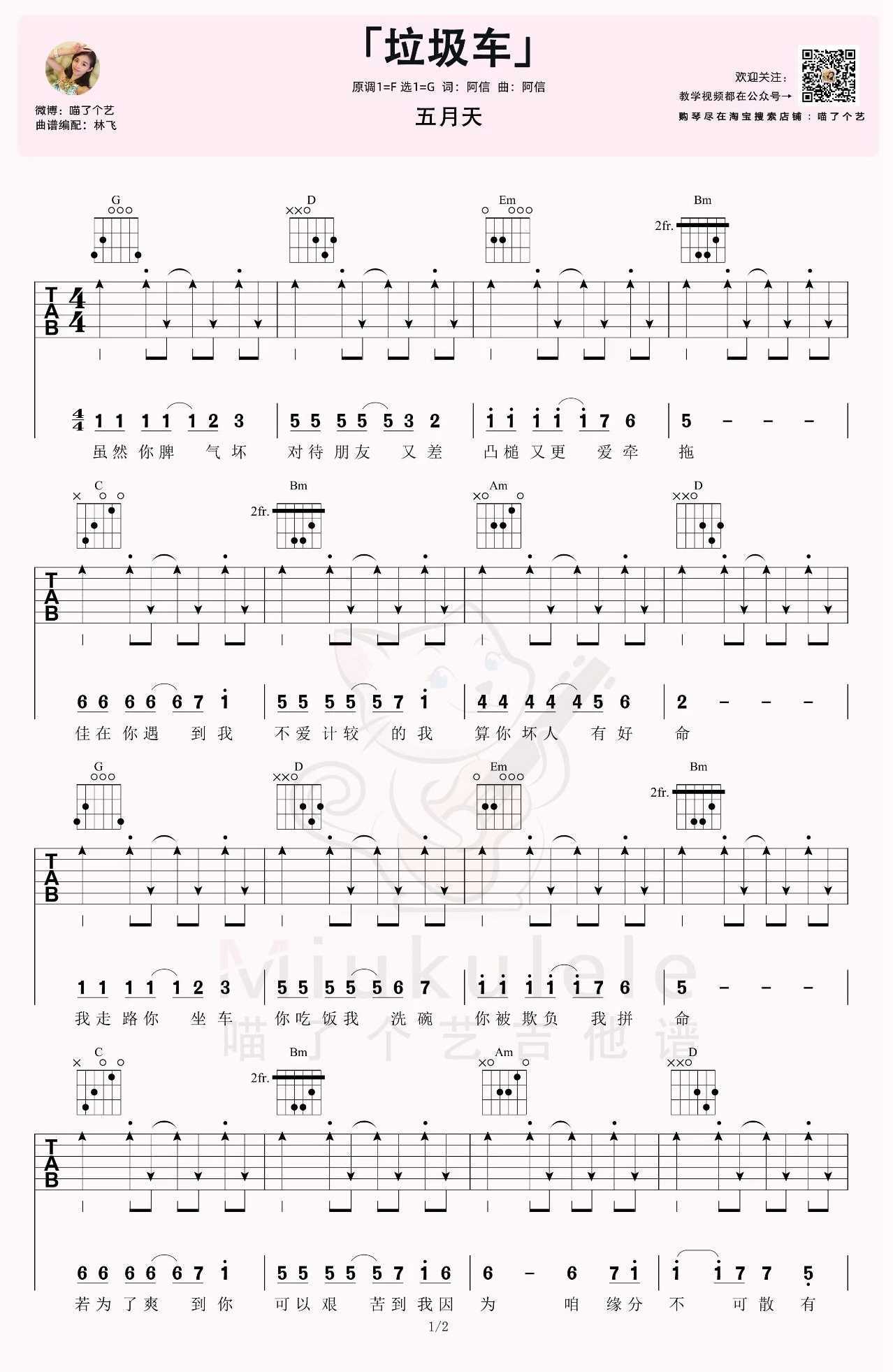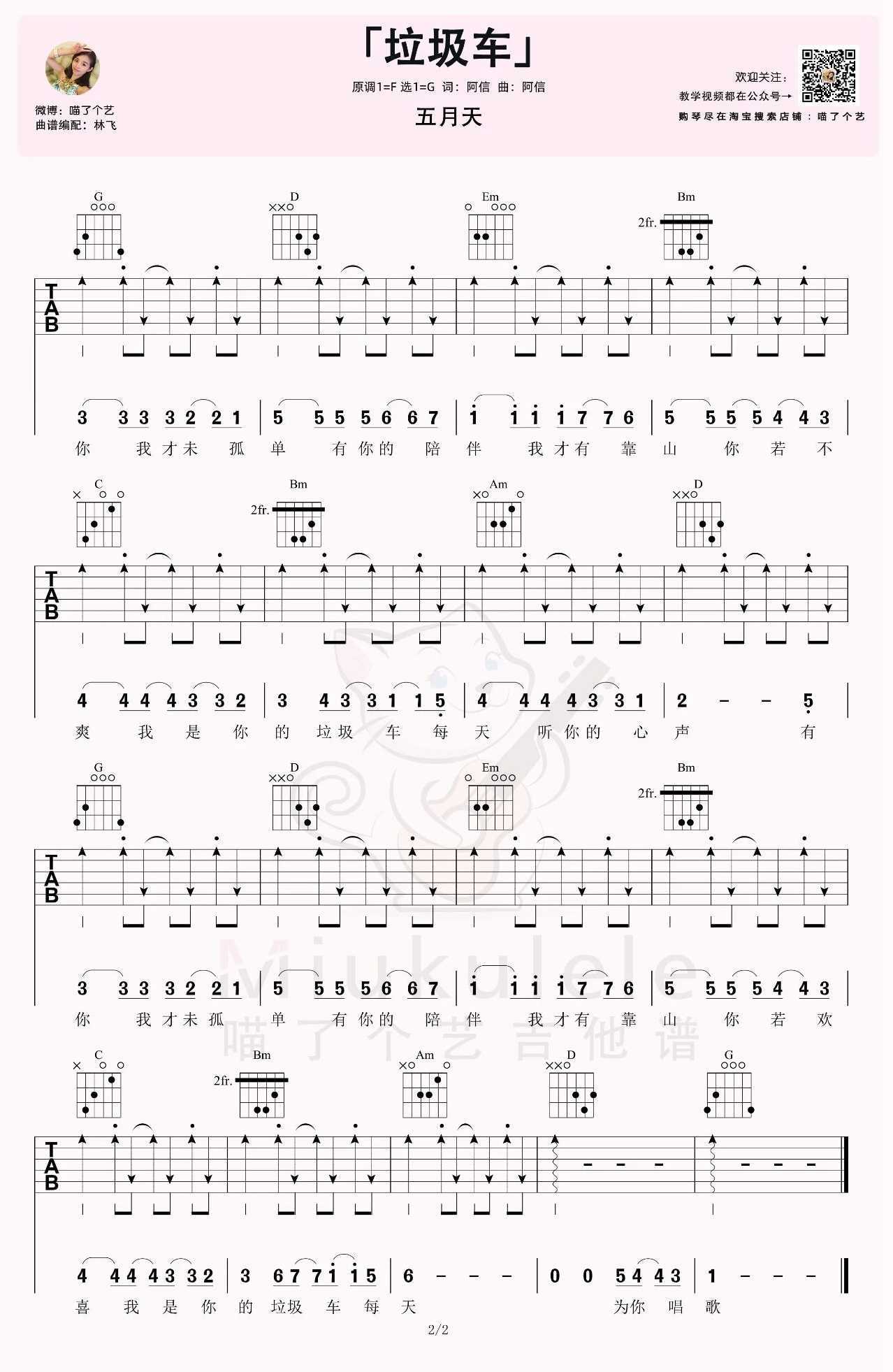 曲谱介绍: 五月天演唱的一首歌曲,4/4拍的节奏,这首歌曲的原调为F调,这里曲谱采用了G调指法进行编配,演唱时降全音调弦可回到原调,也可根据个人实际嗓音情况选择不降音或夹几品。曲谱由琴谱网更新上传,来源于@喵了个艺编配出品。这首五月天的五周年之歌是首很温柔,很温暖的歌,每当情绪不好,遇上问题时有个人做自己的“垃圾车”,可以将自己的烦恼全部清走,感谢那个愿意做自己“垃圾车”的人。