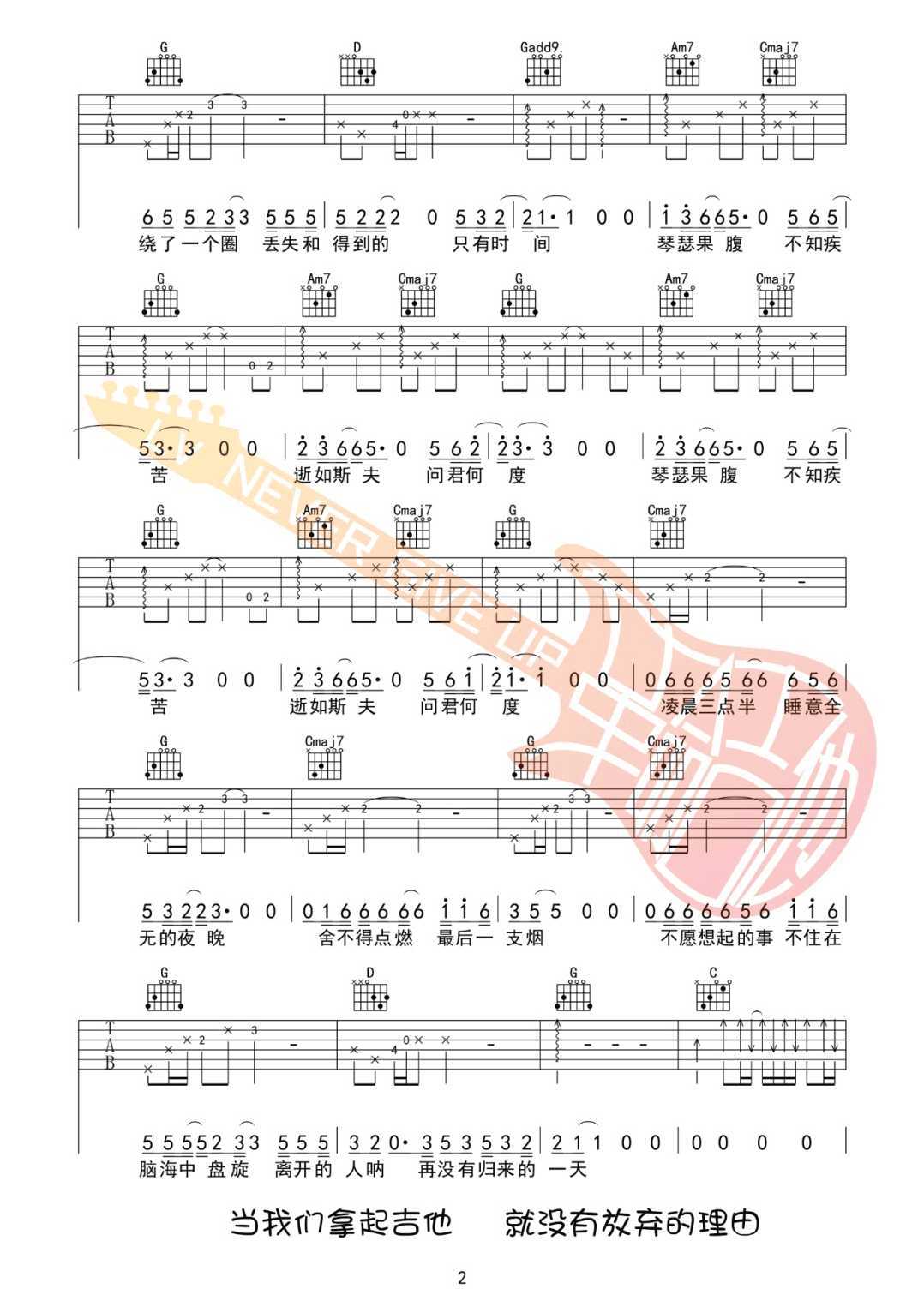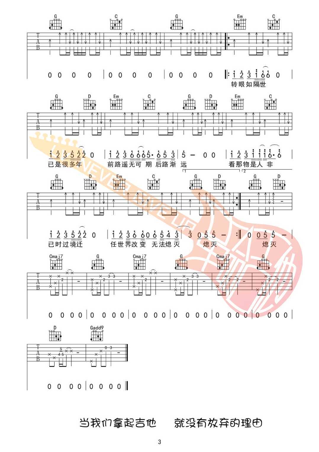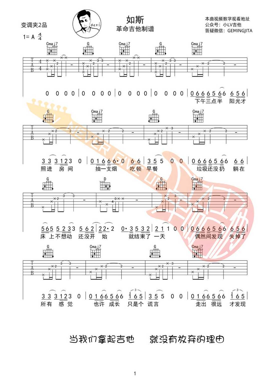 曲谱介绍: 丢火车乐队演唱的一首歌曲,4/4拍的节奏,这首歌曲的原调为A调,这里曲谱采用了G调指法进行编配,演唱时夹变调夹2品可回到原调,也可根据个人实际嗓音情况选择。曲谱由琴谱网更新上传,来源于@革命吉他编配出品。在那么多清醒的午夜时分,杂糅进主唱轻盈自然的唱腔,丢火车的歌如同安慰剂般为浮华的世界带来片刻简单、真诚与诗意。《如斯》,时光点滴反复推敲,耐人寻味。