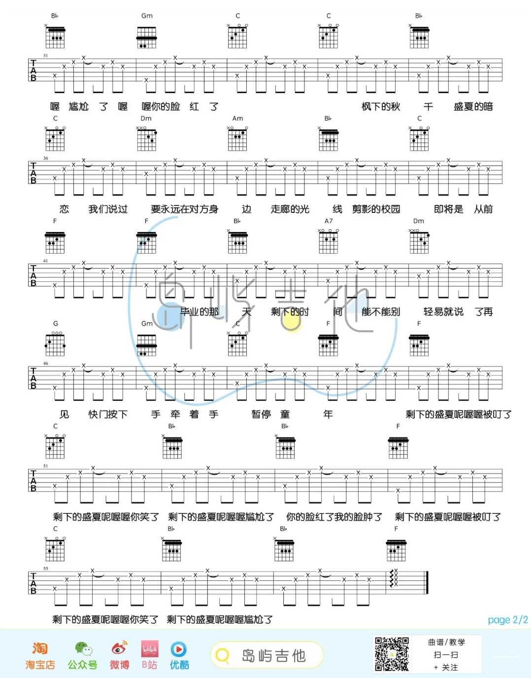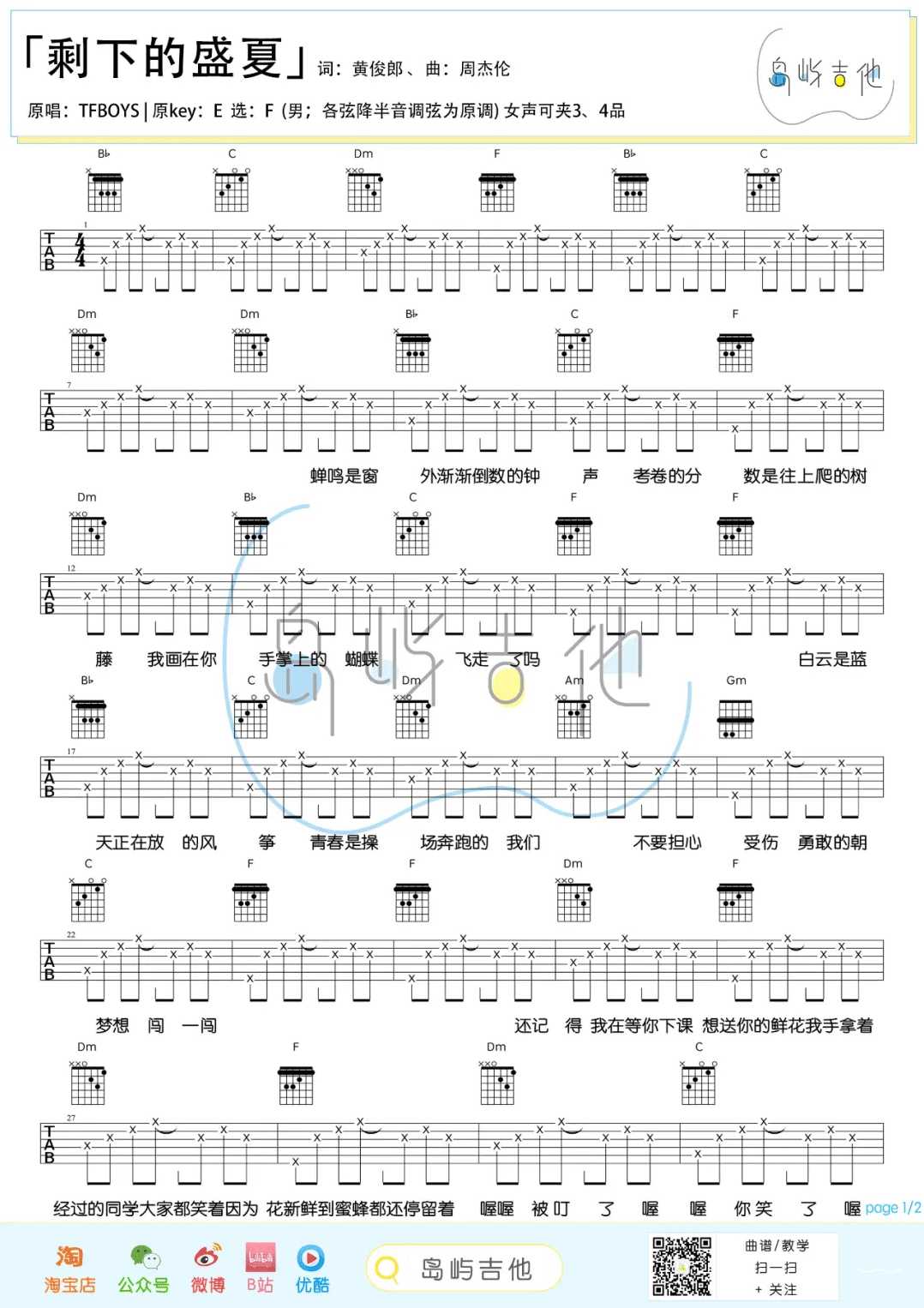 曲谱介绍: TFboys演唱的一首歌曲,4/4拍的节奏,这首歌曲的原调为E调,这里曲谱采用了F调指法进行编配,演唱时降半音调弦可回到原调,也可根据个人实际嗓音情况选择不降音或夹几品。曲谱由琴谱网更新上传,来源于@岛屿吉他编配出品。熟悉的Jay式风格,暖暖的清新校园风,以清新的校园生活为背景,讲述了毕业季离别时的不舍与淡淡的眷恋。歌曲也展现了三小只满满的青春活力,动听的旋律让人耳目一新,温暖的歌词让人回忆青春。