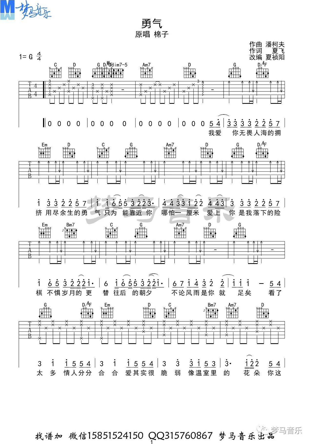 曲谱介绍: 棉子演唱的一首歌曲,4/4拍的节奏,这首歌曲的原调为E调,这里曲谱采用了G调指法进行编配,演唱时可根据个人情况选择变调夹,曲谱由琴谱网更新上传,来源于@梦马音乐编配出品。梁静茹的《勇气》告诉我们,爱真的需要勇气,棉子的《勇气》告诉我们,爱你用尽一生的勇气。两首不同演唱风格的《勇气》带给听众的都是积极向上的正能量。
