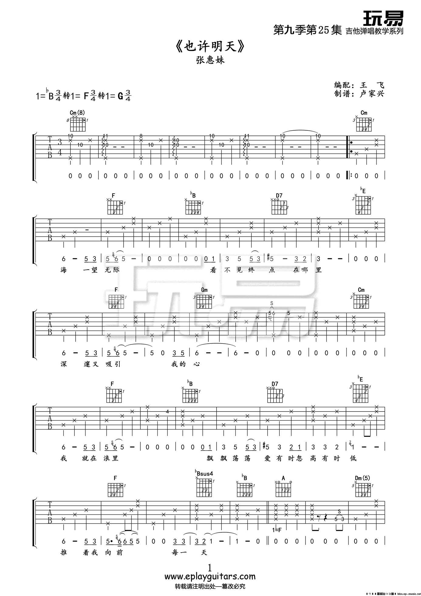 曲谱介绍: 张惠妹演唱的一首歌曲,3/4拍的节奏,这首歌曲的原调为降B调,这里曲谱采用了降B调指法进行编配,演唱时可不夹变调夹,曲谱由琴谱网更新上传,来源于@玩易吉他编配出品。低沉的钢琴,磅礴的弦乐,大气不失深沉,而副歌中那充满爆发力的声音,一次次呐喊着明天与未来,呐喊着人生与情感,让人振奋。结束时的那一段出彩的演绎为歌曲做了一个完美的完结。