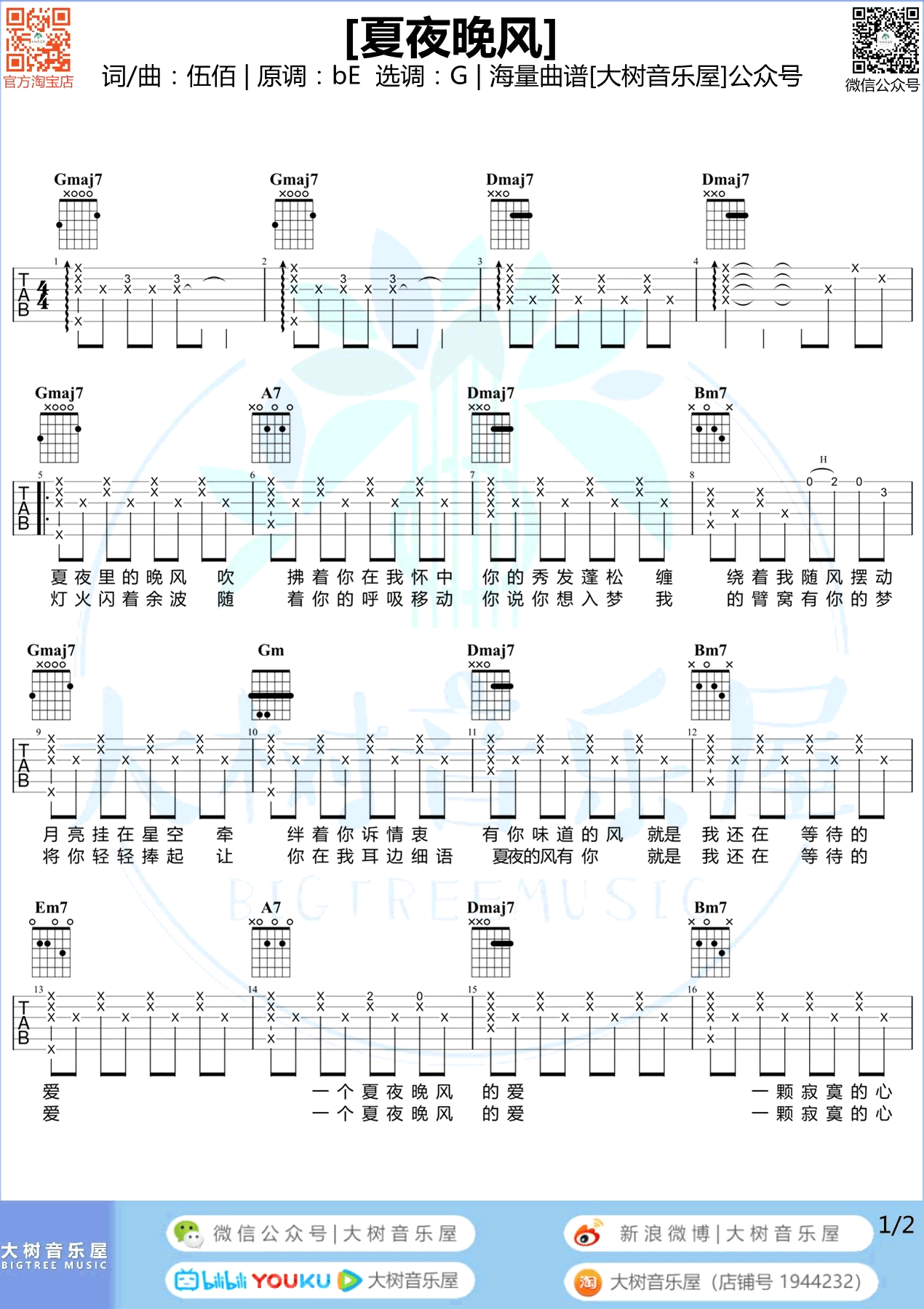 曲谱介绍: 夏夜晚风吉他谱,伍佰一首经典,仿佛一阵夜风拂面而过,你会被这首温柔歌曲所抚慰。《夏夜晚风》吉他弹唱谱,选用G调指法编配,两张图片六线谱。 月色如水,爱情如诗,它散发着温暖的光芒,让人感受到爱情的美好与温馨。倾听这首歌曲,你会仿佛置身于一个静谧的晚夏夜里,微风轻拂,丝丝凉意扑面而来。