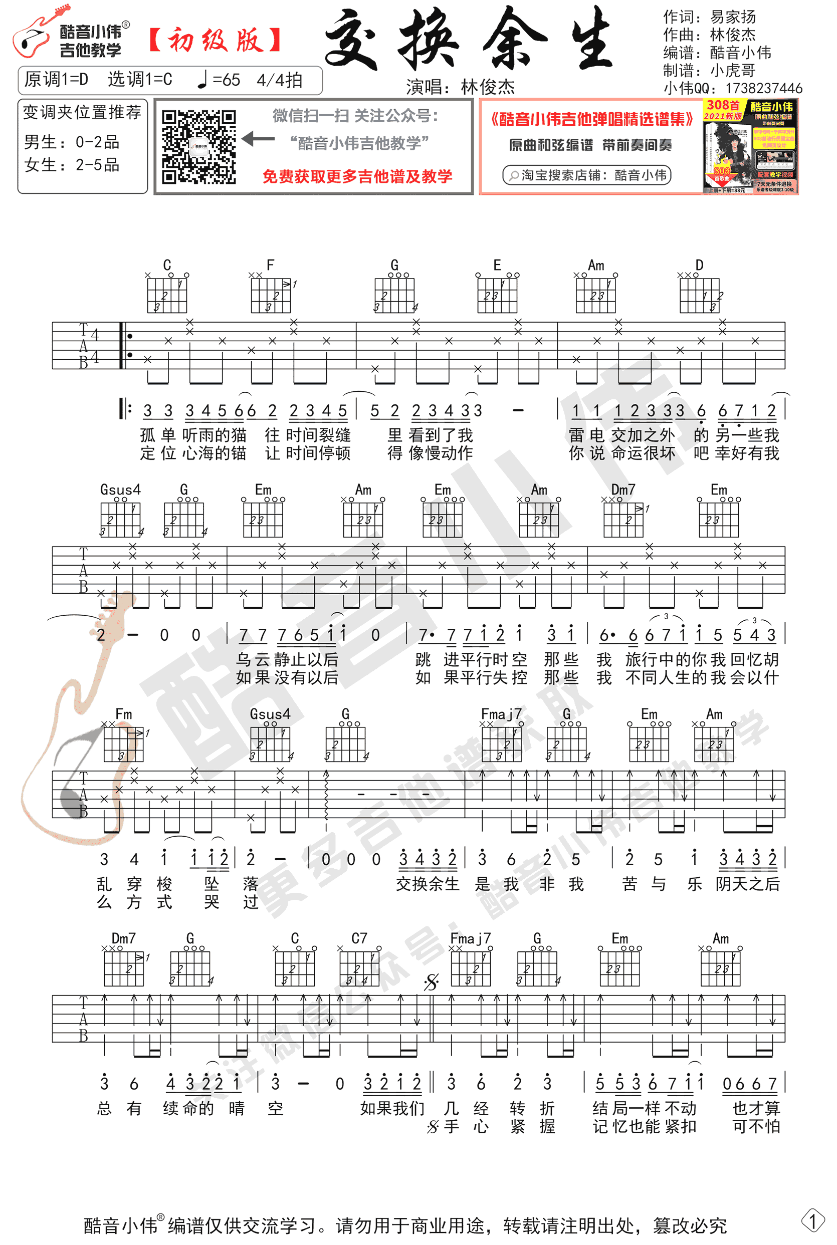 曲谱介绍: 交换余生吉他谱,林俊杰演唱,细腻的歌声,伴随着起起伏伏的旋律,如同带领我们进入一段陌生的时空之旅。《交换余生》吉他弹唱谱,原调D,选用C调指法简单版编配,一共两张图片谱, 爱的故事在音符中轻徜,回忆往昔,是否曾感遗憾,过往的你我,在时光的洪流中逝去。如果有机会,你是否愿意和谁,交换余生,一起走过这纷扰的尘世?
