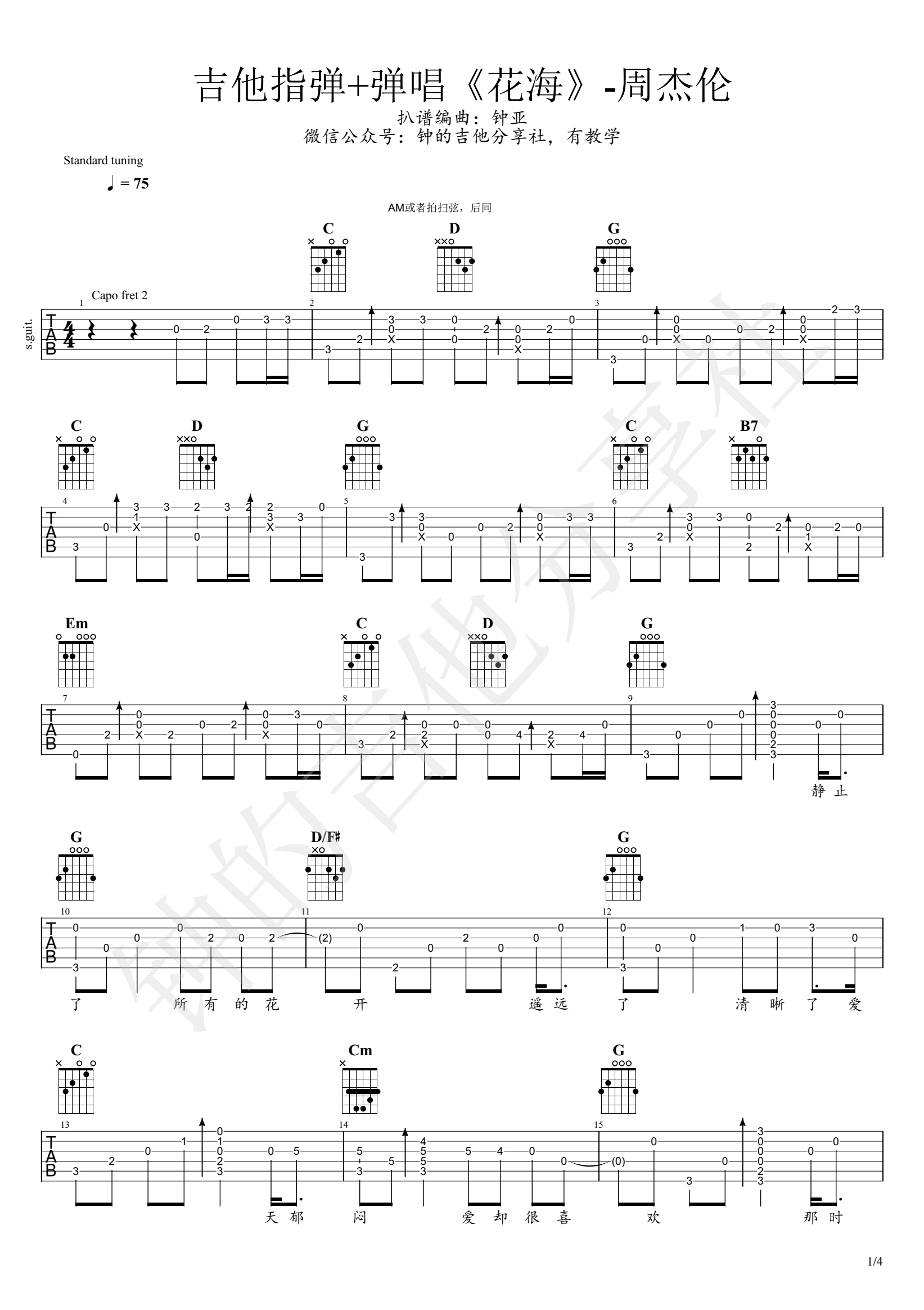 曲谱介绍: 花海指弹谱,改编自周杰伦的经典情歌,附歌曲吉他指弹视频,方便琴友们学习参考。《花海》吉他独奏谱,G调和弦指法,标准调弦编配,一共4张图片六线谱。 满岛国风情的歌曲,以周杰伦独特的唱腔演绎,在柔美的旋律中散发着浓郁的异域风情。编配说明:本曲谱为完整版,带有间奏,演示视频没有弹全部。