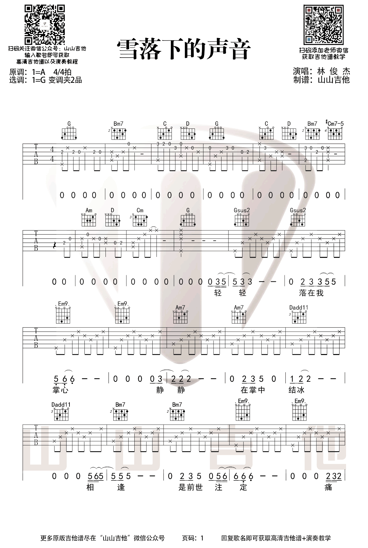 曲谱介绍: 《雪落下的声音》吉他谱,梦想的声音节目中,林俊杰惊艳地改编并翻唱了这首歌曲,深深地打动了众多听众的心。《雪落下的声音》吉他弹唱谱,选用G调指法编配,Capo2品,共三张图片六线谱。琴谱网上传。 我们为大家提供了吉他弹唱教学视频,希望喜欢的音乐爱好者能够在音符间找到自己的梦想和灵感。