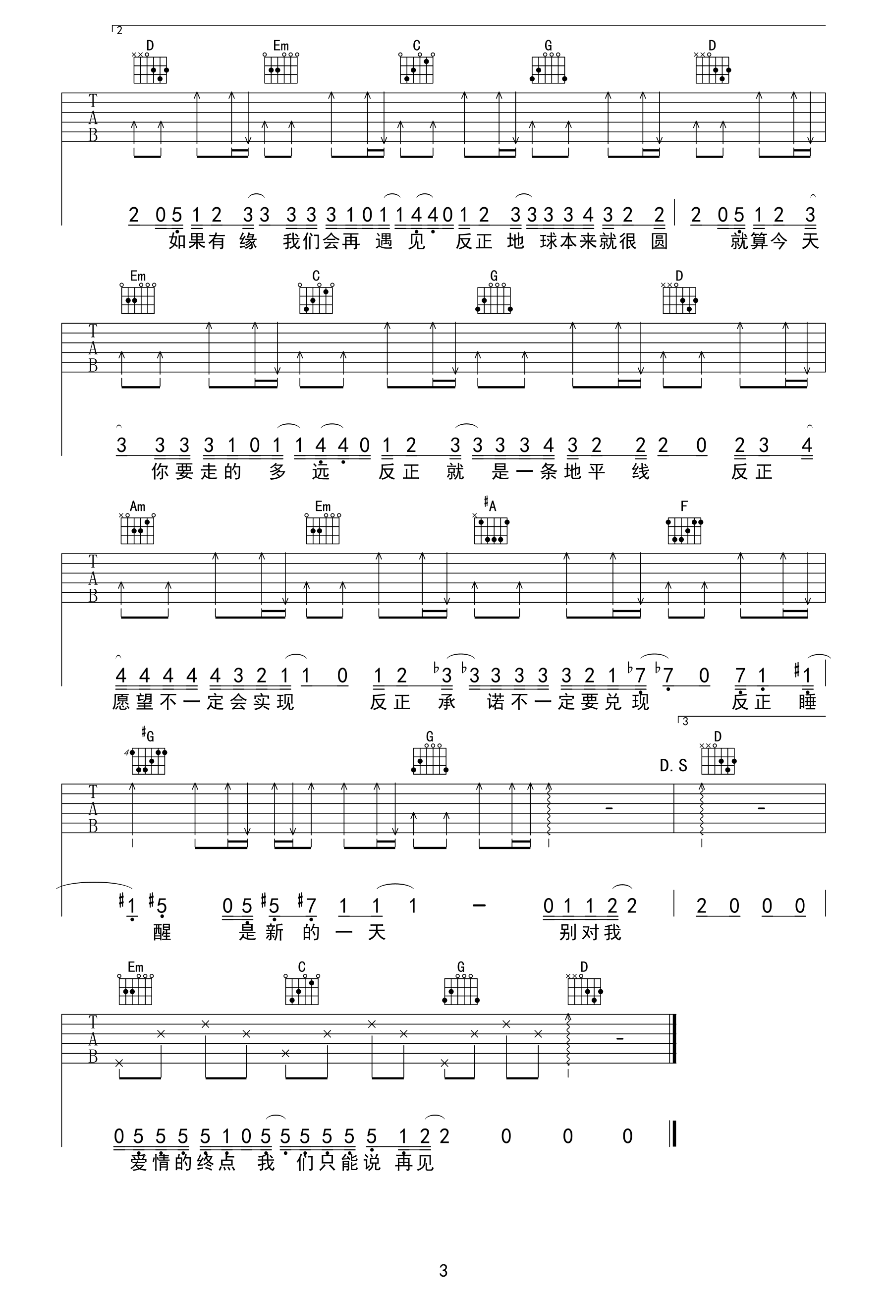 曲谱介绍: 再见吉他谱,邓紫棋词曲创作演唱,一首唯美动听的虐心情歌。《再见》吉他弹唱谱,选用G调指法编配,一共三张高清图片六线谱,琴谱网更新上传。 每当倾听这首歌,总会感受到内心的一丝悸动,仿佛与过去挥手再见、充满向未来前行的勇气。歌声带领我们走过笑与泪的时光,直到最后的解脱和释放。