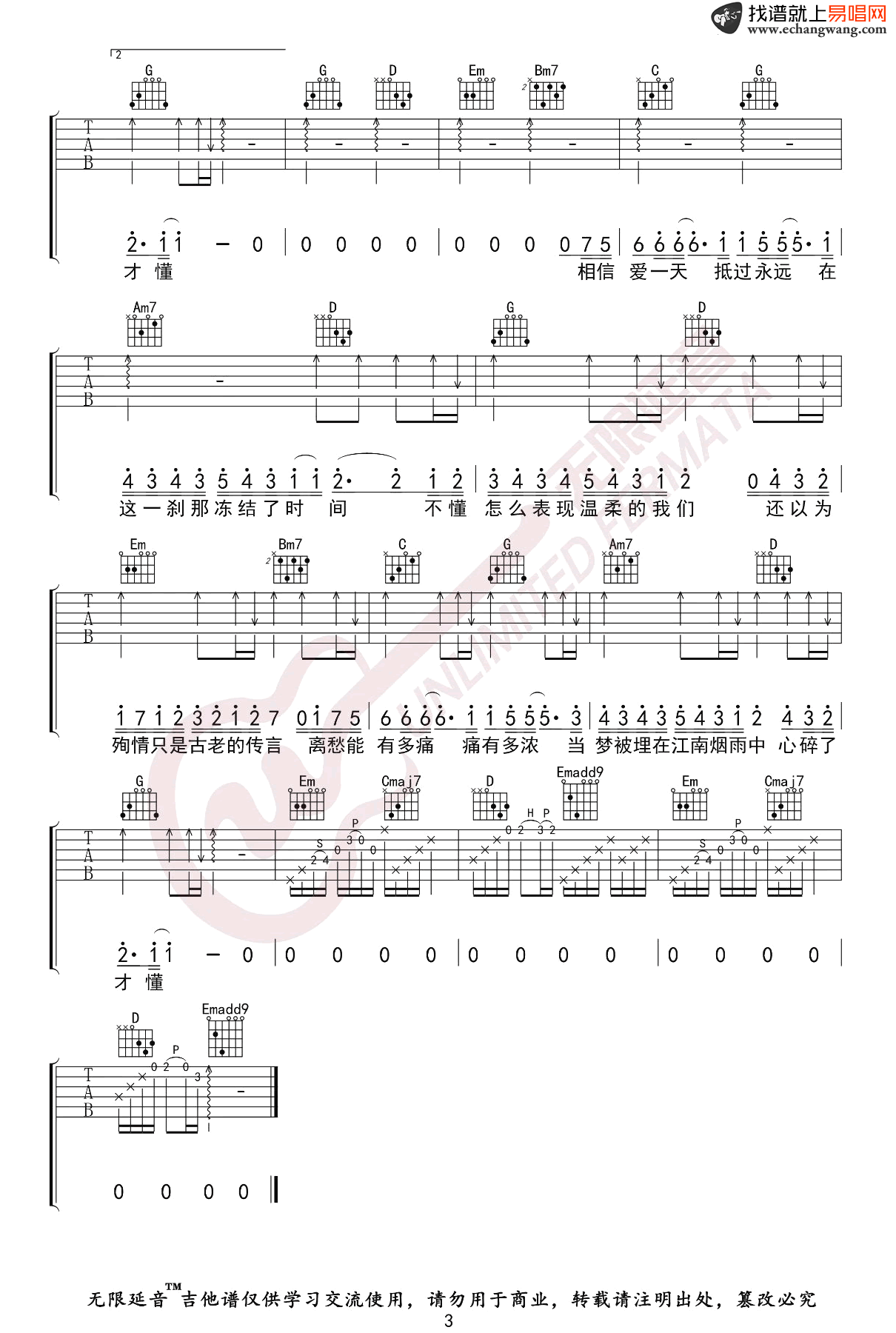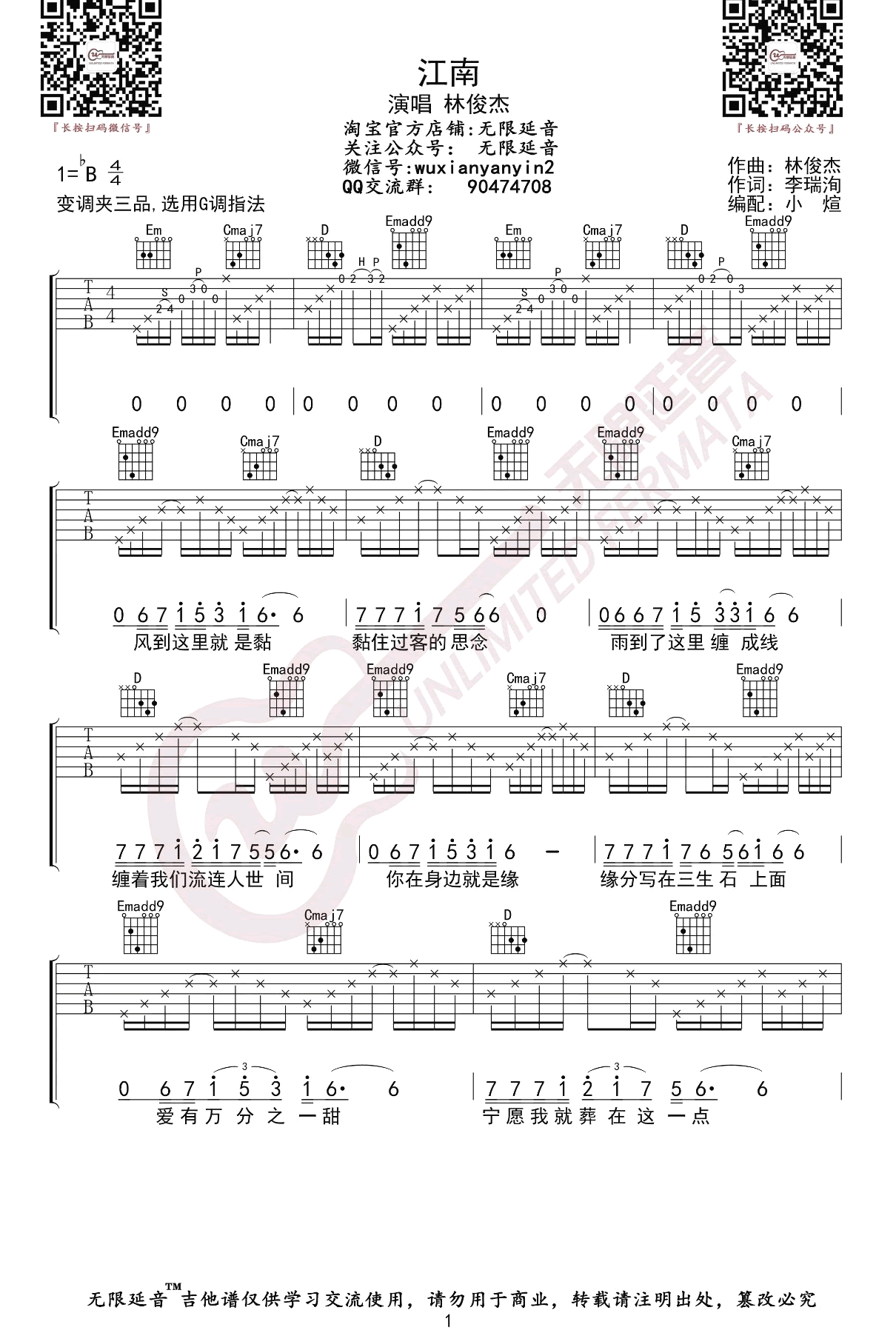 曲谱介绍: 江南吉他谱,林俊杰经典成名金曲,这首老歌已经发行了十九年,仿佛转眼之间。《江南》吉他弹唱谱,采用G调指法来编配,变调夹3品。琴谱网上传。 古老的烟雨江南,以及那些殉情的传说,勾起了多少人的旧时回忆。JJ的歌喉将这些故事娓娓道来,仿佛穿越了时空,把我们带回了往昔的岁月。岁月匆匆,时间流逝,但这些美好的回忆却永远存在着。