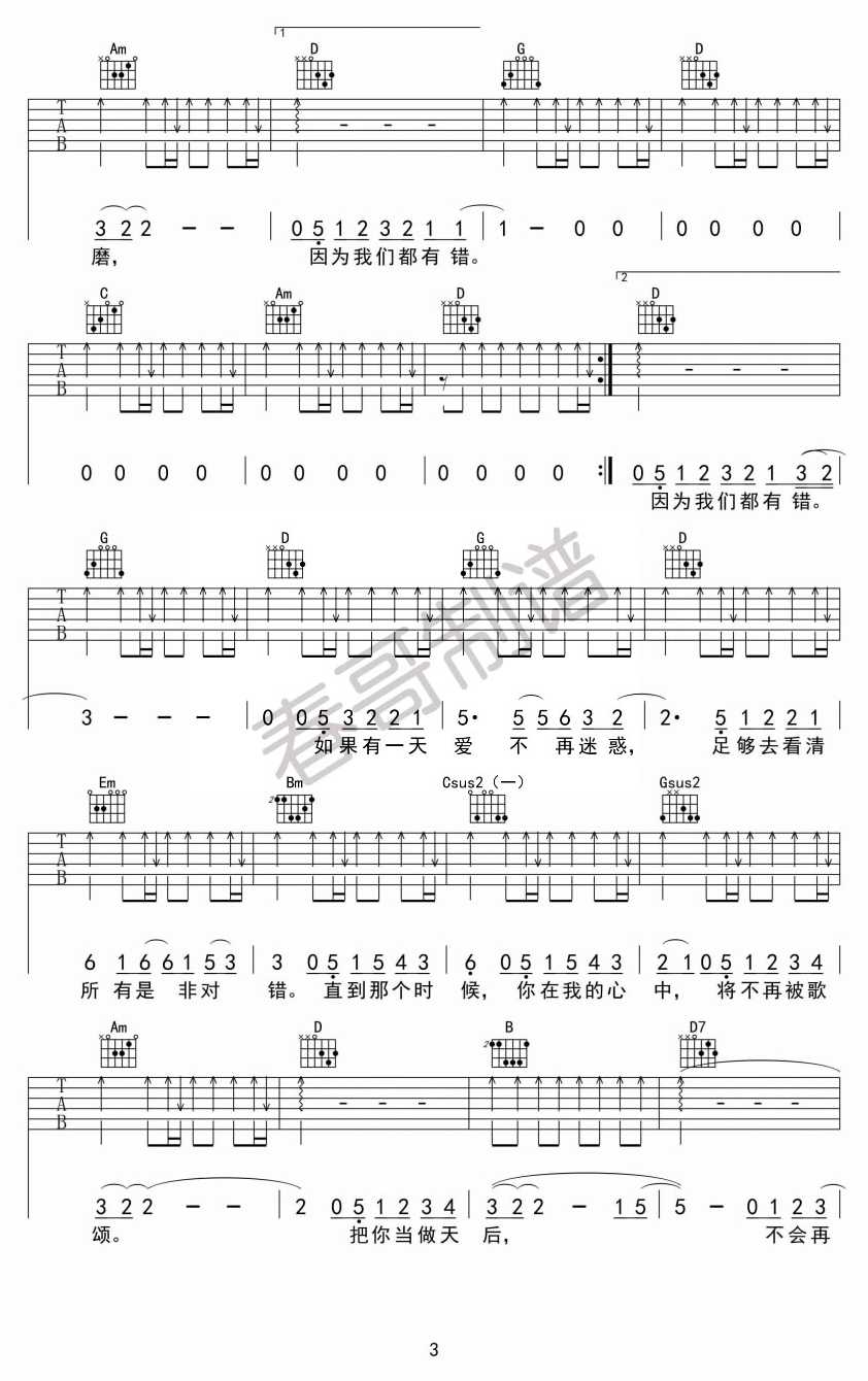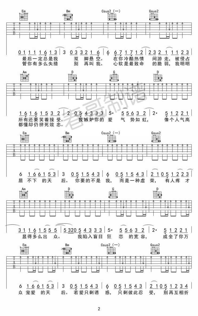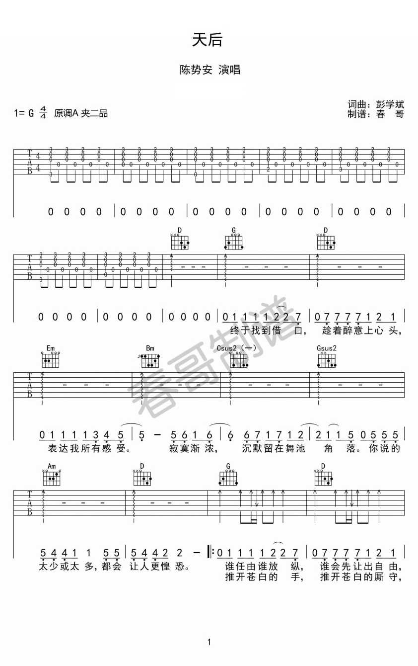 曲谱介绍: 天后吉他谱,陈势安的一首经典成名歌曲。《天后》吉他弹唱谱,原调为A选用G调指法,变调夹Capo2品。六线谱共三张图片。 淡淡而沙哑的歌声,带你踏入主人公在爱情中纠结矛盾的内心世界。那并非激昂的呐喊,仅有无奈的释然,以不失风度而细诉心酸的奉献。