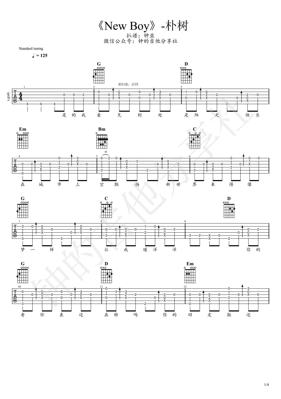 曲谱介绍: New Boy指弹谱,朴树的一首经典老歌改编,《New Boy》吉他指弹谱,完整编配共四张六线谱图片。附上@钟亚老师带来的曲谱配套指弹演示视频。本曲谱选用的是房东的猫唱G调,也可以伴奏让女生唱。