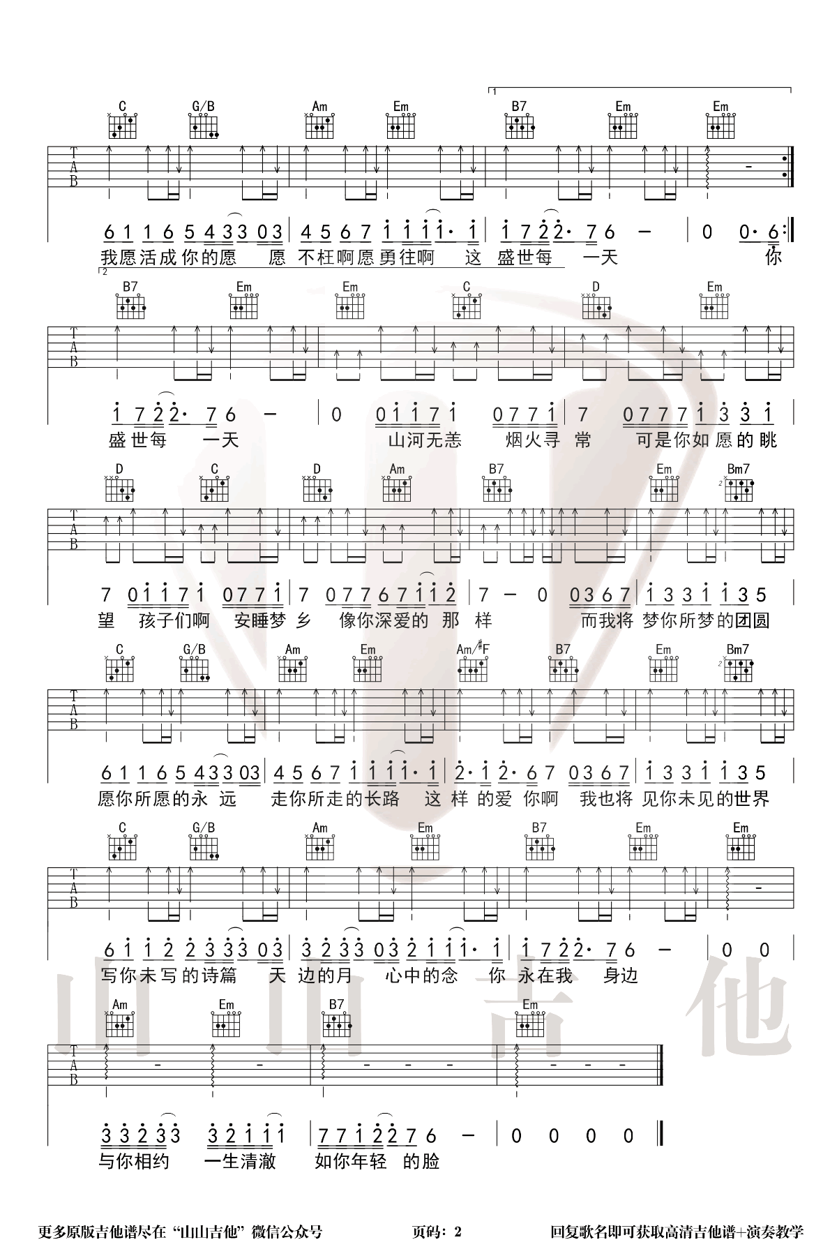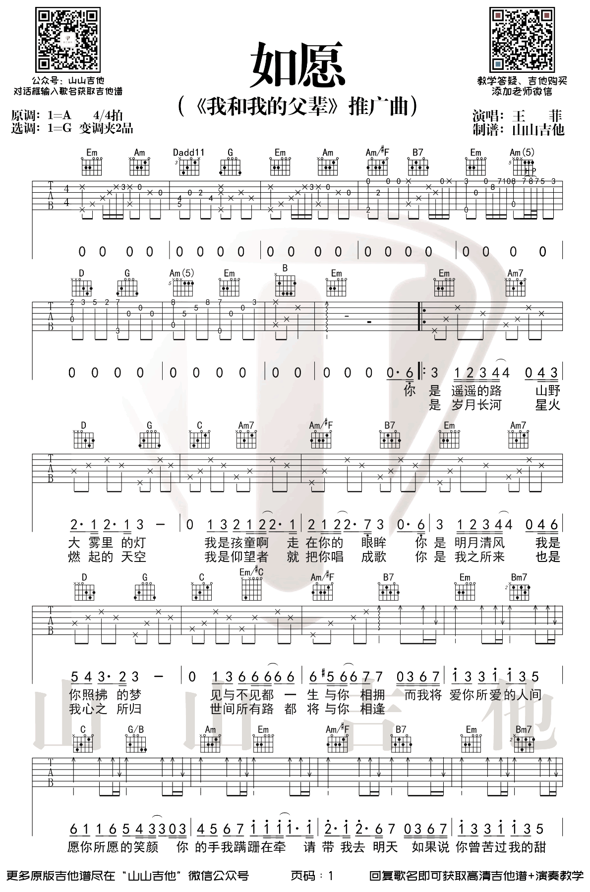 曲谱介绍: 如愿吉他谱,王菲的一首经典歌曲,电影《我和我的父辈》主题曲,如愿吉他弹唱谱,选调G,变调夹二品,共两张弹唱图片谱。王菲的演唱让人们感受到了亲情的温暖和父辈们为我们所付出的一切。它不仅是电影主题曲,更是一首感人至深的家国情怀之歌。王菲的演唱让这首歌曲更加动人,让人们更加珍惜身边的亲人和家人,也更加感慨祖国的伟大和父辈们为我们所做的一切。