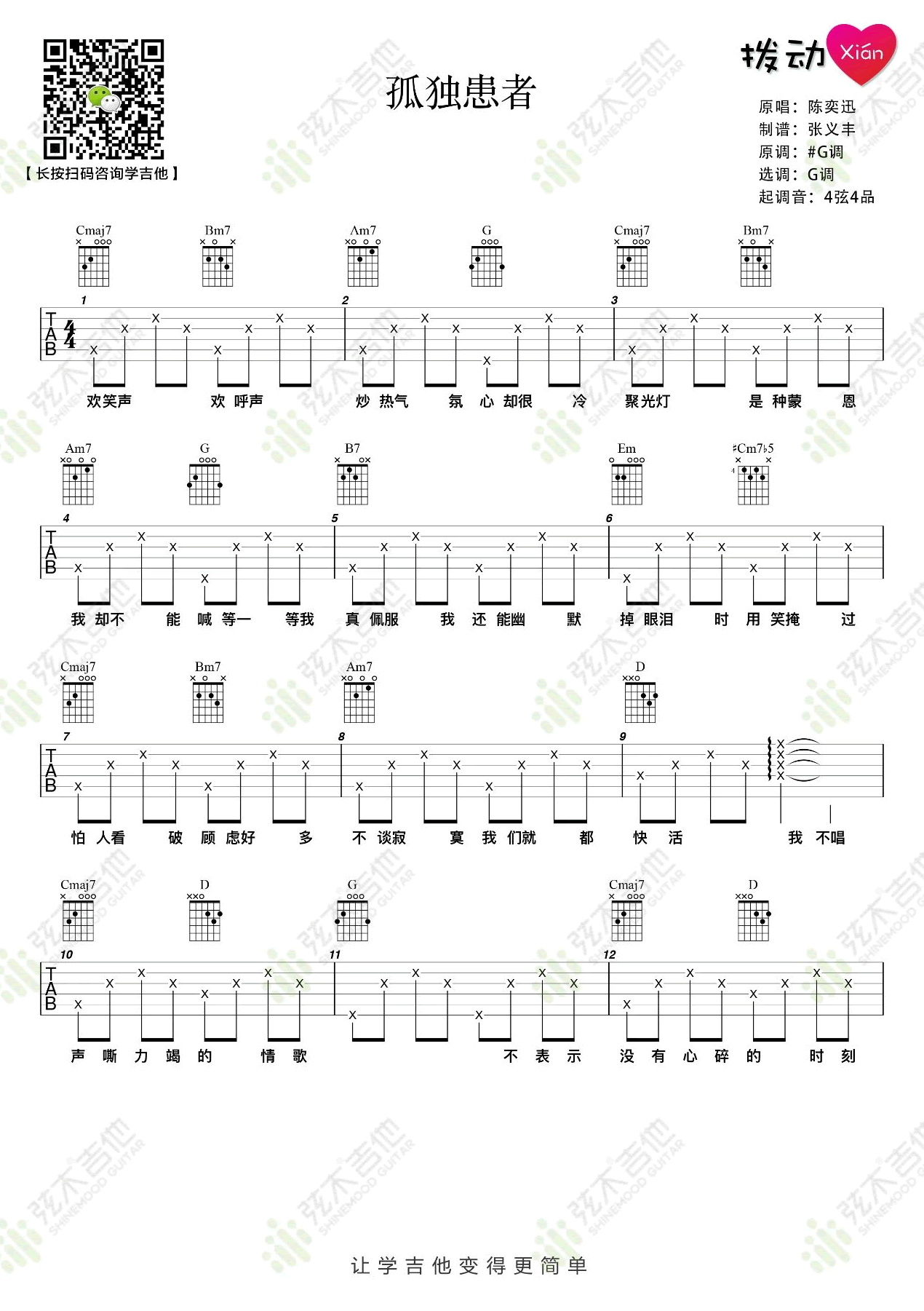 曲谱介绍: 孤独患者吉他谱,陈奕迅演唱的一首歌曲,《孤独患者》吉他弹唱六线谱,选用G调和弦指法编配,共两张图片六线谱,附上配套演示教学视频。 无论是过去还是现在,这首歌曲都能够让人们感受到生活中的孤独和无助,同时也能够给人们带来一份温暖和安慰。它告诉我们,即使我们身处困境,也不要放弃希望,相信未来会更好。