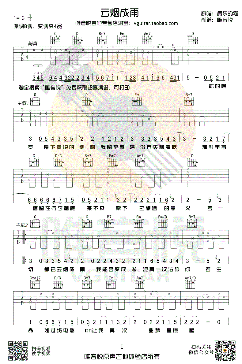 曲谱介绍: 云烟成雨吉他谱,房东的猫为《我是江小白》片尾曲献唱的一首民谣,如同一股清泉,缓缓流淌着忧伤的曲调,却带着治愈的力量。选用G调指法,云烟成雨吉他弹唱谱,Capo4品,共三张图片谱。 歌声唱出了青春的开场和散场,热情与坦然的交织,在人们心中激起了遥远而深刻的回忆。人生也是如此,有起点和终点,有热情和坦然,有欢笑和泪水。让我们好好感受生命中的美好与哀愁。