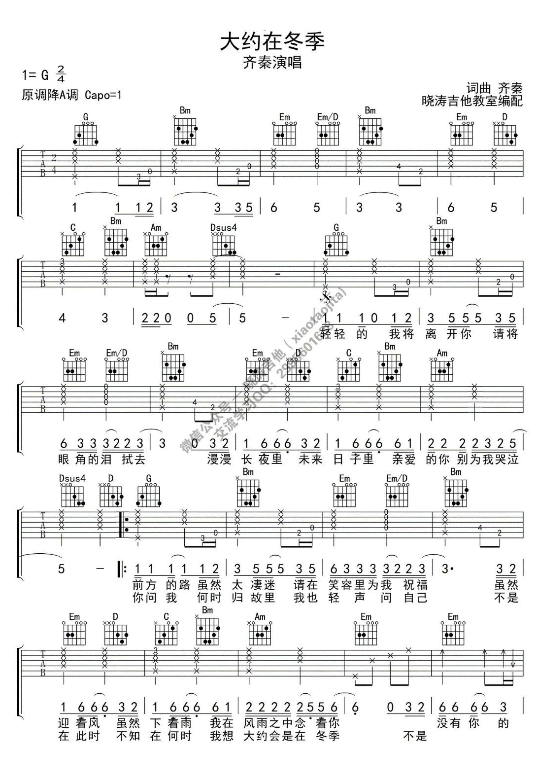 曲谱介绍: 大约在冬季吉他谱,齐秦一首怀旧经典老歌,《大约在冬季》吉他六线谱,原调降A,选用G调指法编配,变调夹1品,随谱附上配套吉他弹唱教学视频,琴谱网上传分享。 这首老歌曾温暖了无数人的心房,仿佛在那个寒冬之季,以最柔美的旋律融化寒冷,将如丝般的温暖送到每一个人心间。让我们重新聆听这首歌曲,让内心的渴望和寂寞在音乐中得到真正的释放。