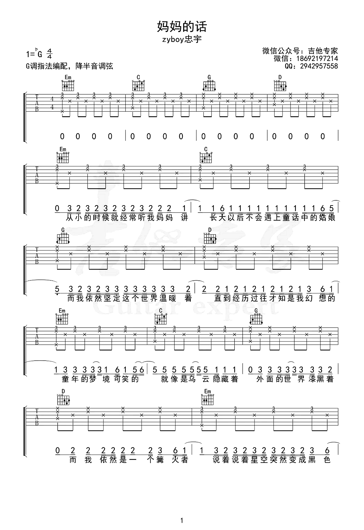 妈妈的话吉他谱 - Zyboy忠宇 - G调吉他弹唱谱 - 原版