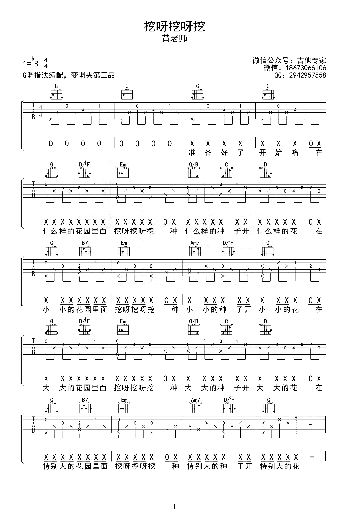 曲谱介绍: 挖呀挖呀挖吉他谱,一首火遍网络的儿歌,根据花开富贵黄老师的原曲编配。《花园种花》吉他弹唱谱,原调bB,选用G调和弦指法,变调夹第三品,共一张图片六线谱。 准备好了嘛?好了那我们跟着音乐一起来咯。把我们的小手变成花园,准备好了开始喽。在什么样的花园里面,挖呀挖呀挖,种什么样的种子,开什么样的花……