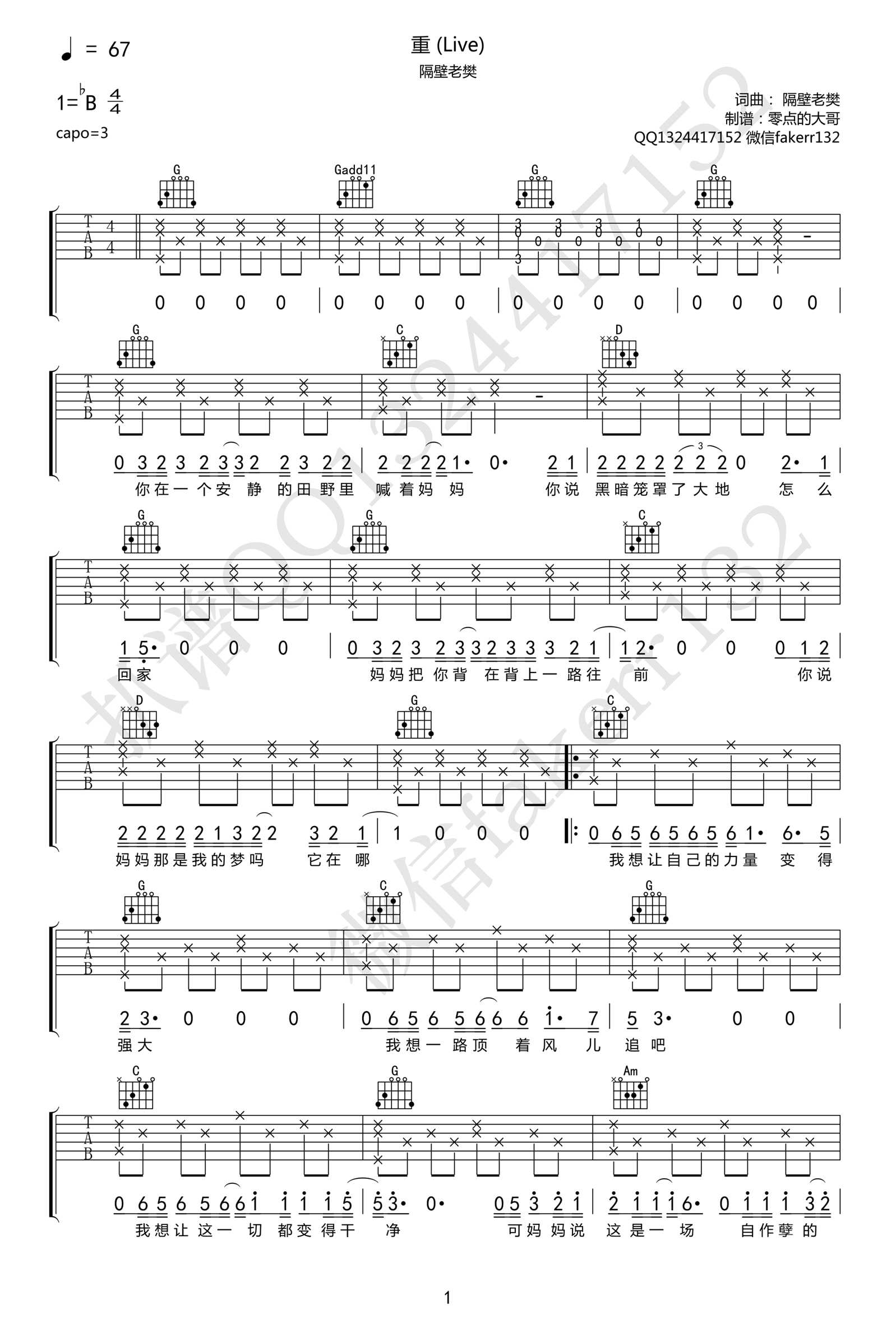 曲谱介绍: 隔壁老樊演唱的一首歌曲,4/4拍的节奏,这首歌曲的原调为降B调,这里曲谱采用了G调指法进行编配,演唱时夹变调夹3品可回到原调,也可根据个人实际嗓音情况选择。曲谱由琴谱网更新上传,曲谱来源于网络转载,编配制谱者暂不详。这首歌讲述了一个热血少年在成长道路上的点点滴滴,刚开始需要自己的母亲,再慢慢经历社会,最后再回到安静的故事。