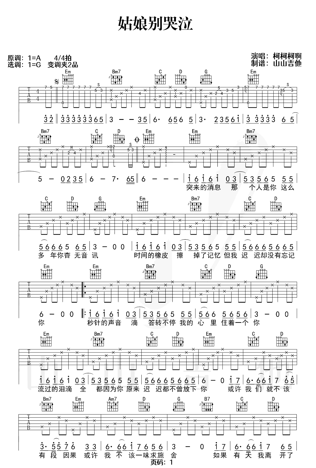 姑娘别哭泣吉他谱 - 柯柯柯啊 - G调吉他弹唱谱
