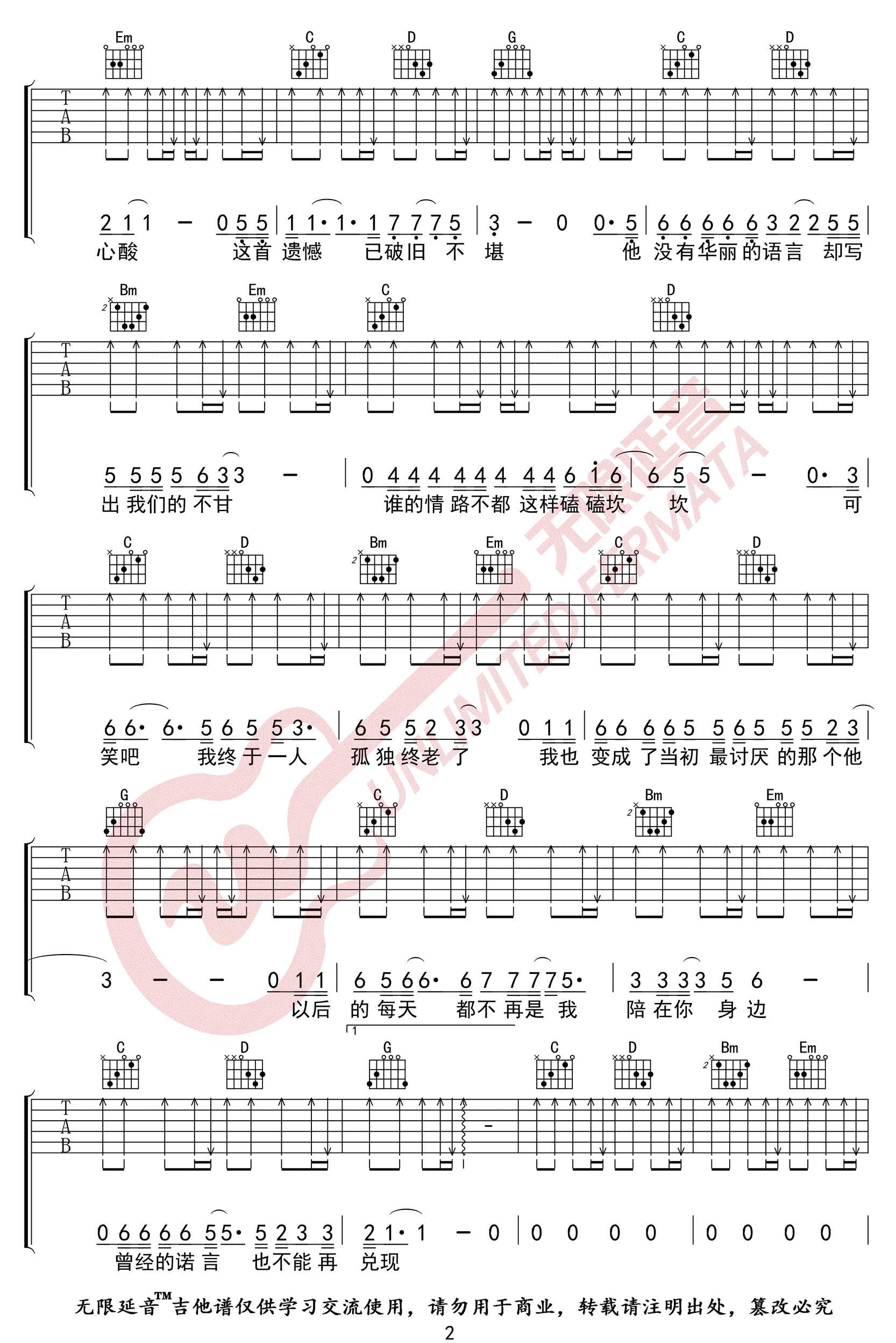 曲谱介绍: 是你大哥阿演唱的一首歌曲,4/4拍的节奏,这首歌曲的原调为A调,这里曲谱采用了G调指法进行编配,演唱时夹变调夹2品可回到原调,也可根据个人实际嗓音情况选择。曲谱由琴谱网更新上传,来源于@无限延音编配出品。这首歌演绎地是绝大多数人在是在分手时的遗憾,其缓慢的前奏,柔和的咬字,深沉的嗓音,其饱含真情的演唱风格令人动容。