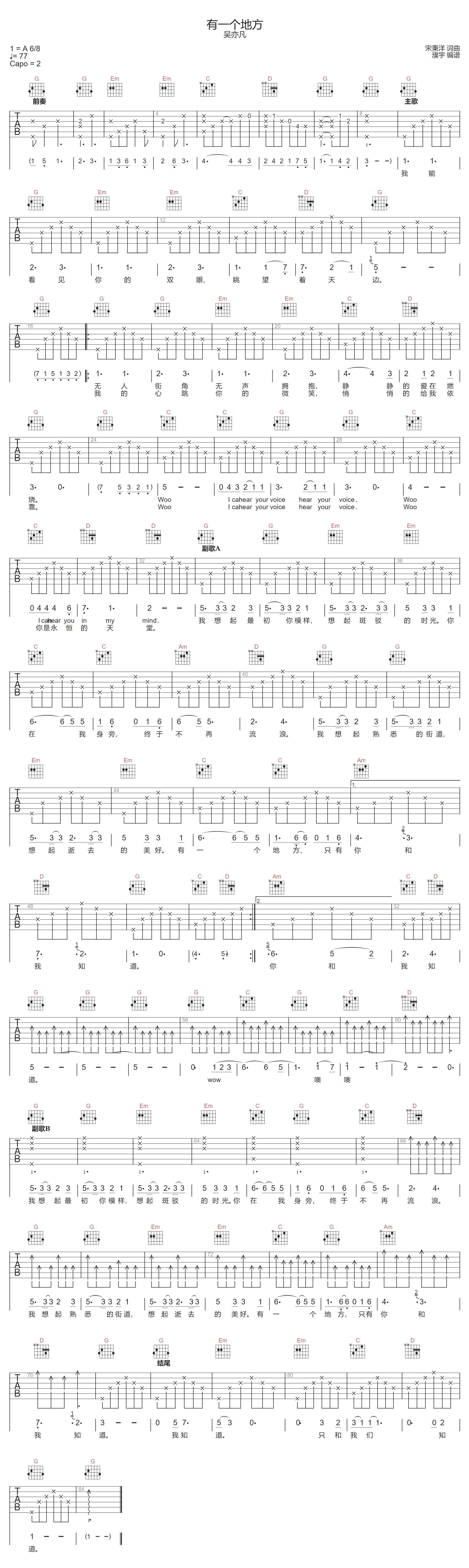有一个地方吉他谱 - 吴亦凡 - G调吉他弹唱谱 - 原版