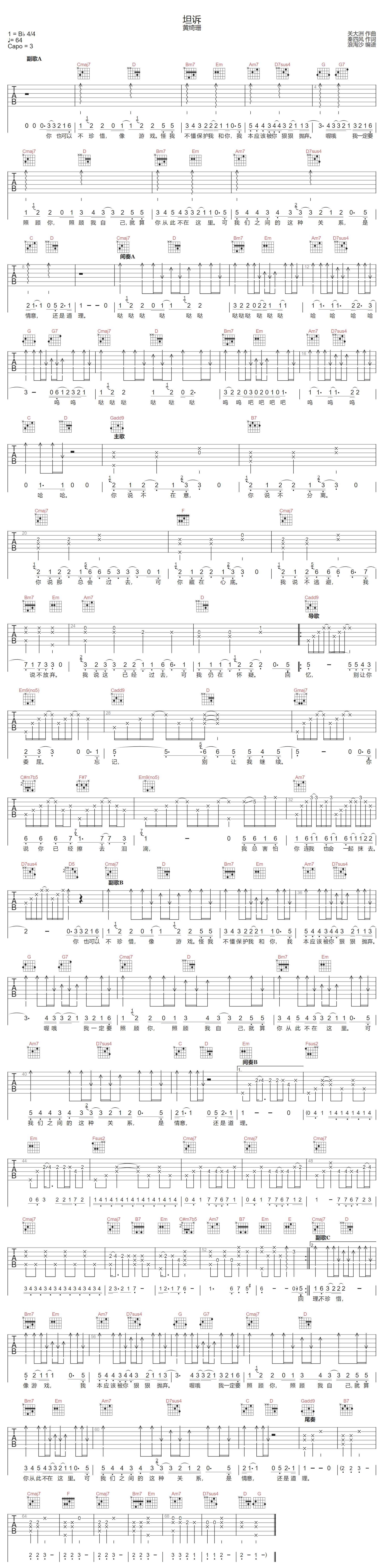 曲谱介绍: 黄绮珊演唱的一首歌曲,4/4拍的节奏,这首歌曲的原调为降B调,这里曲谱采用了G调指法进行编配,演唱时夹变调夹3品可回到原调,也可根据个人实际嗓音情况选择。曲谱由琴谱网更新上传,来源于@浪淘沙编配出品。
