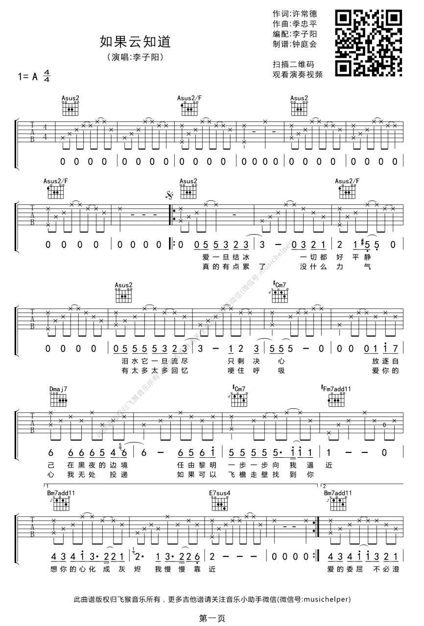如果云知道吉他谱 - 李子阳 - A调吉他弹唱谱
