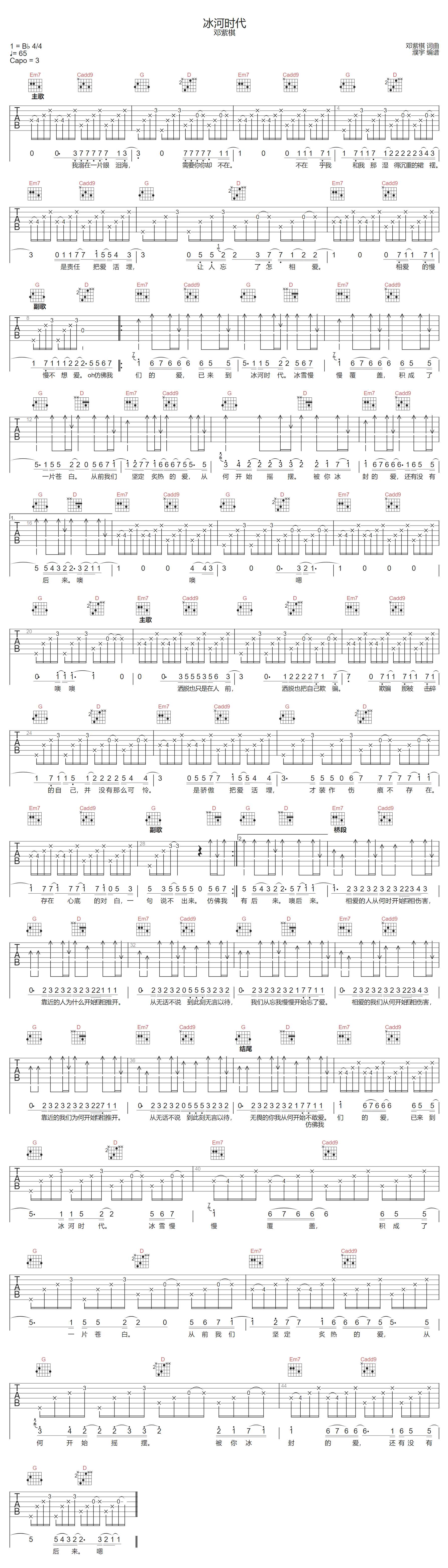 曲谱介绍: 邓紫棋演唱的一首歌曲,4/4拍的节奏,这首歌曲的原调为降B调,这里曲谱采用了G调指法进行编配,演唱时夹变调夹3品可回到原调,也可根据个人实际嗓音情况选择。曲谱由琴谱网更新上传,来源于@濮宇编配出品。这是一首“氛围感轻摇滚风的情歌”,“风声元素”一下子将我的心“冰封”,“仿佛我们的爱,已来到冰河时代。冰雪慢慢覆盖,积成了一片苍白。从前我们坚定炙热的爱,从何开始摇摆。