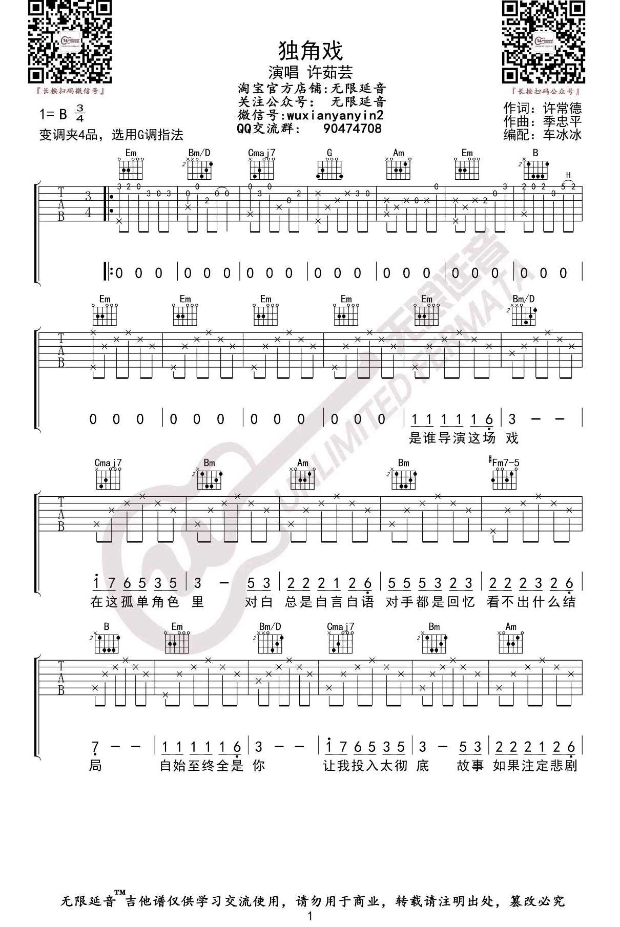 独角戏吉他谱 - 许茹芸 - G调吉他弹唱谱 - 原版