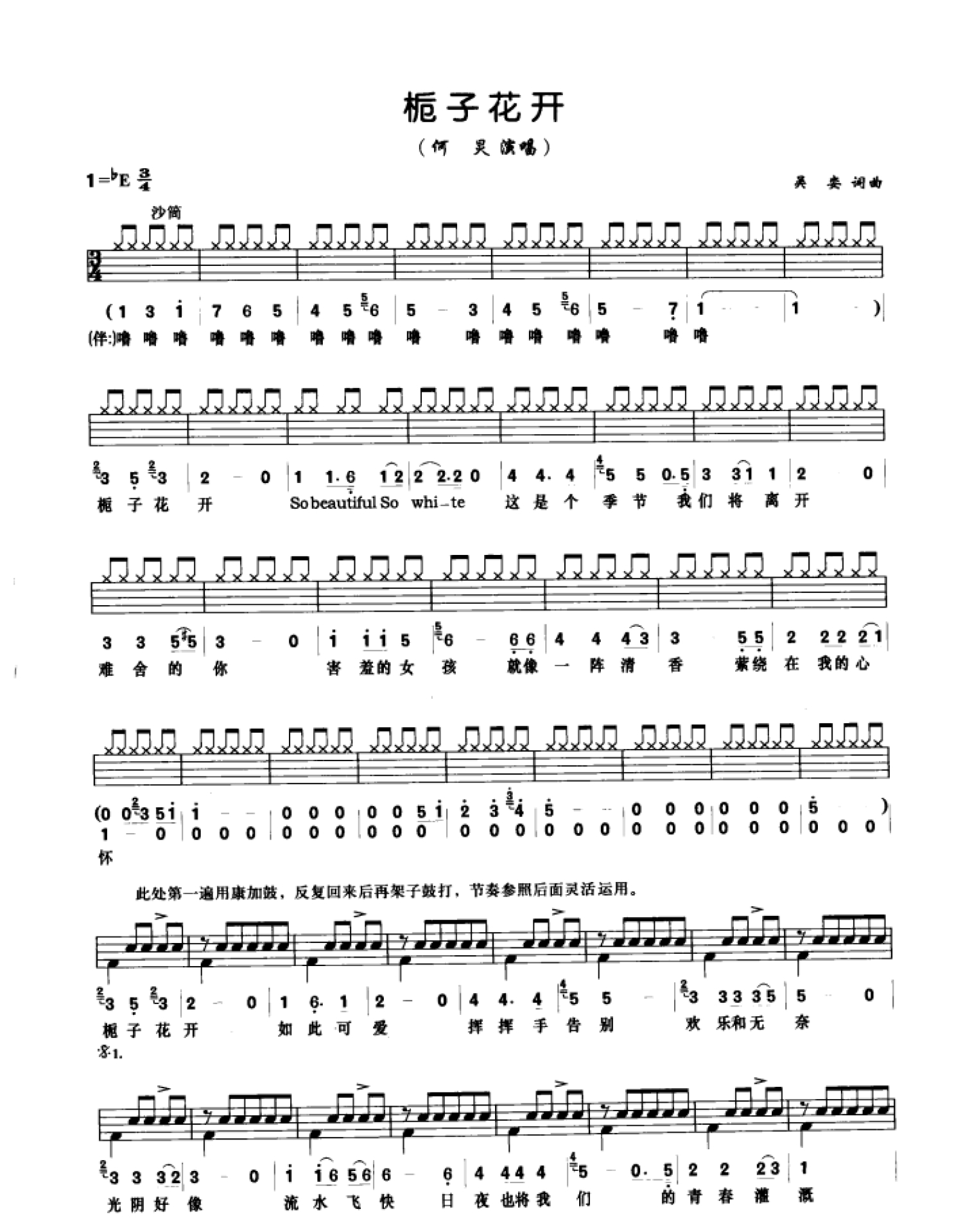 曲谱介绍: 栀子花开(架子鼓谱)-何炅