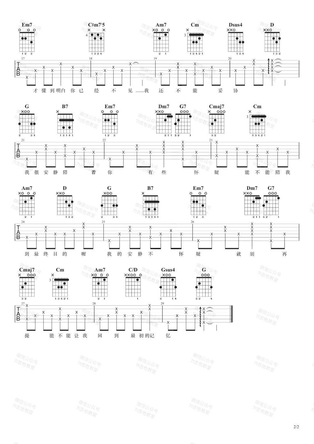 曲谱介绍: 徐佳莹演唱的一首歌曲,4/4拍的节奏,这首歌曲的原调为F调,这里曲谱采用了G调指法进行编配,演唱时降全音调弦可回到原调,也可根据个人实际嗓音情况选择不降音或夹几品。曲谱由琴谱网更新上传,来源于@7T吉他教室编配出品。这首歌是电视剧《夏至未至》片尾曲,徐佳莹用饱含故事的声音将我们带回那个充满香樟气息的校园,以深情细腻的演绎为原声带打响头炮。听,那个你爱的人,依然微笑的看着你,等在原地。