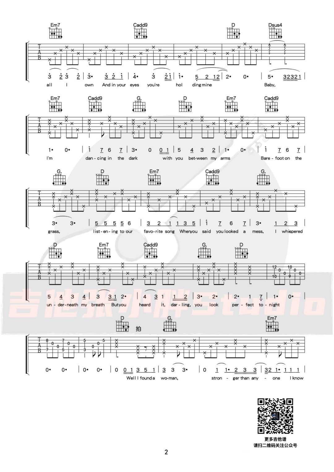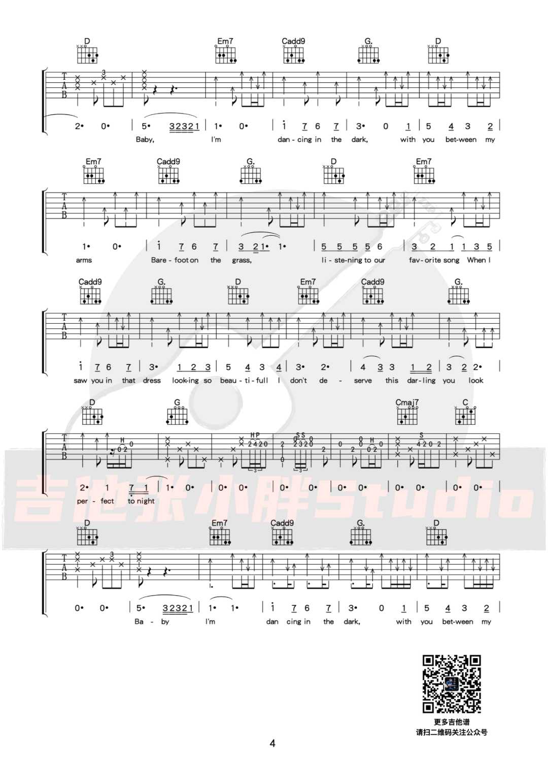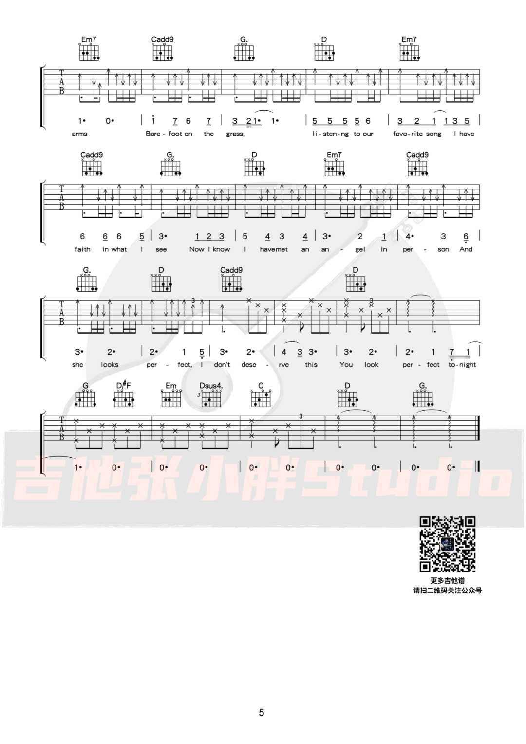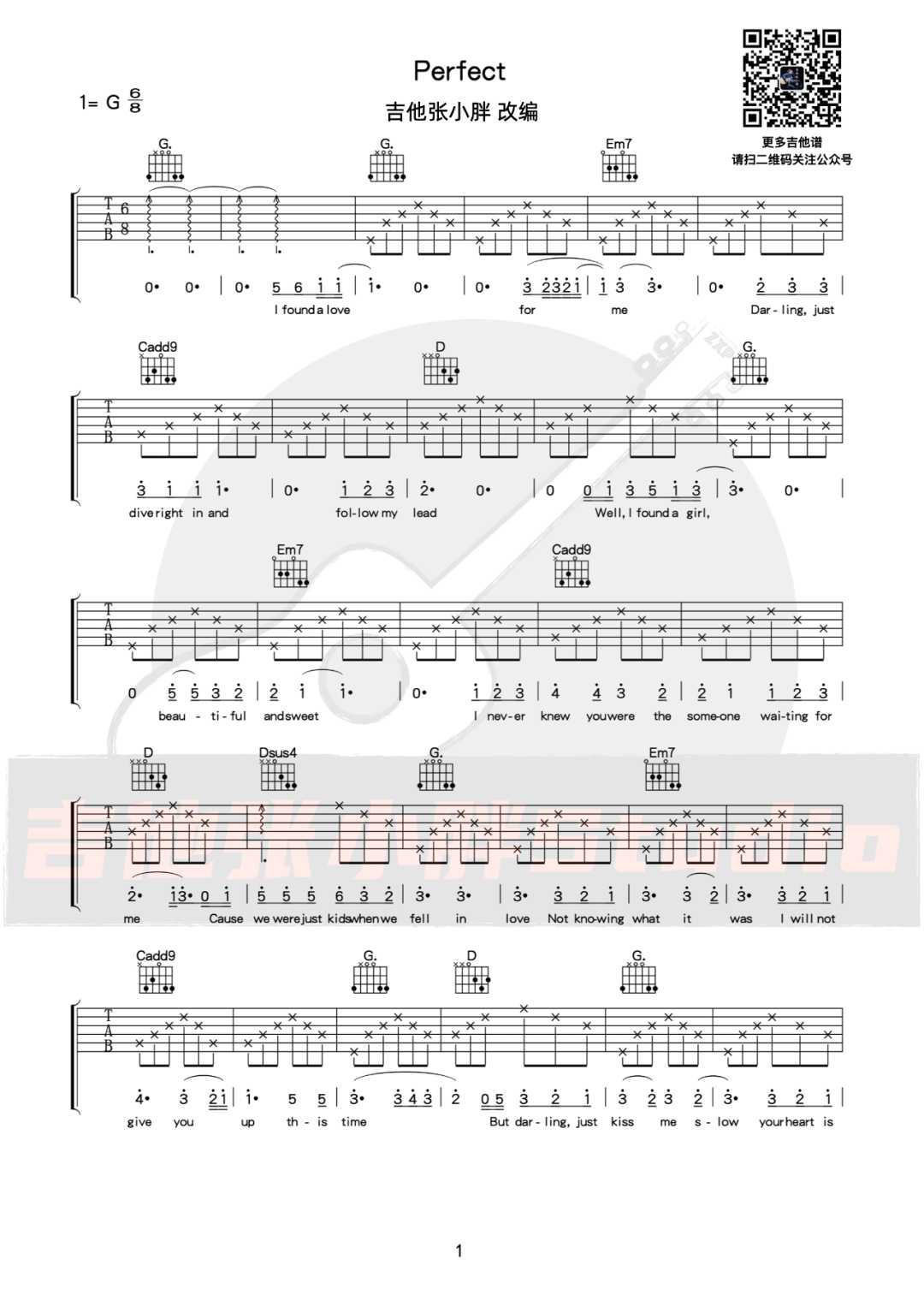 曲谱介绍: Ed-Sheeran演唱的一首歌曲,6/8拍的节奏,这首歌曲的原调为降A调,这里曲谱采用了G调指法进行编配,演唱时夹变调夹1品可回到原调,也可根据个人实际嗓音情况选择。曲谱由琴谱网更新上传,来源于@吉他张小胖编配出品。这首三拍子情歌很适合在婚礼中播放。它温馨动人,完美诠释了爱情童话,令人感动。《Perfect》浪漫到底,飘扬出的柔顺弦乐醉心美丽。