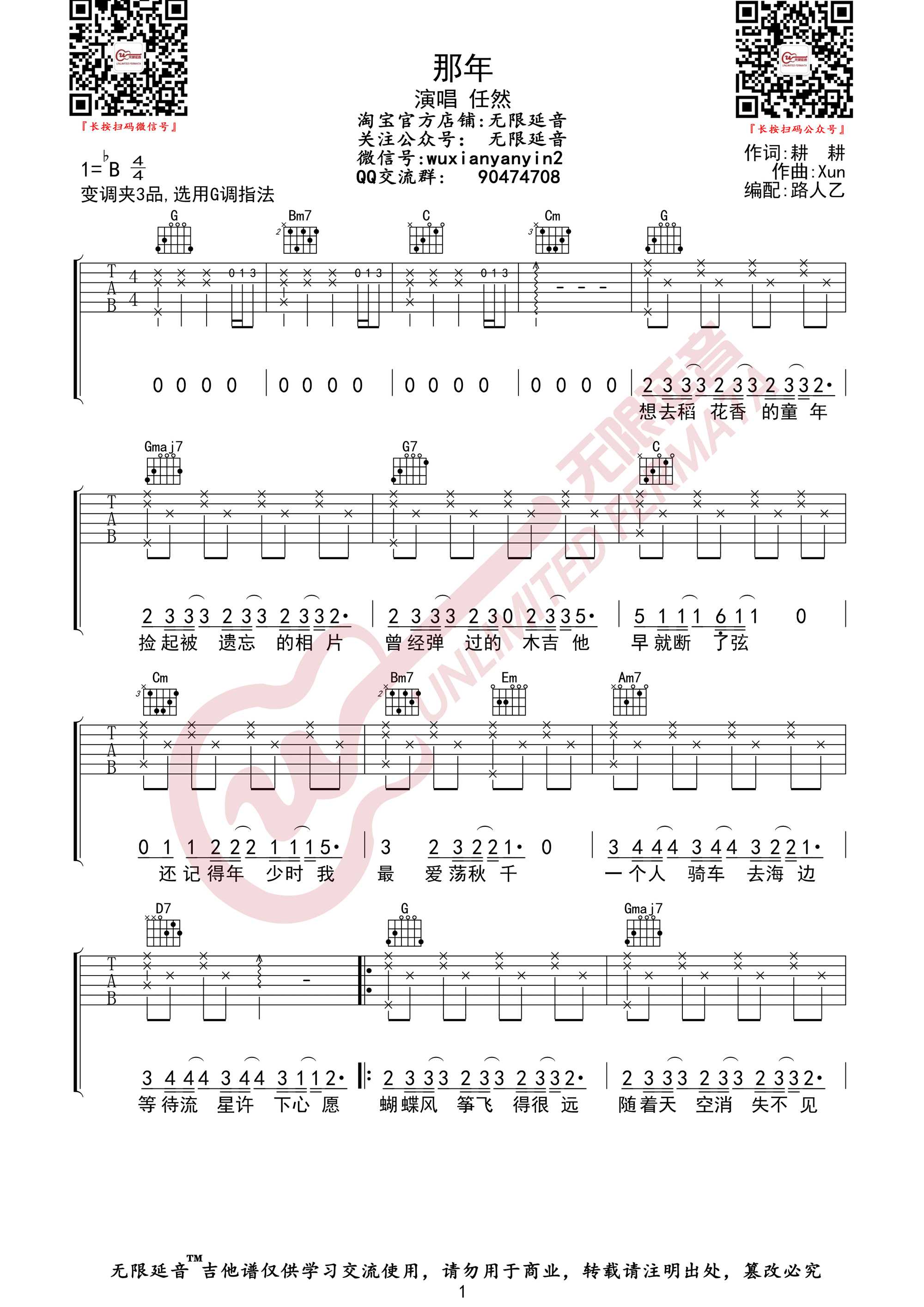 曲谱介绍: 任然演唱的一首歌曲,4/4拍的节奏,这首歌曲的原调为降B调,这里曲谱采用了G调指法进行编配,演唱时夹变调夹3品可回到原调,也可根据个人实际嗓音情况选择。曲谱由琴谱网更新上传,来源于@无限延音编配出品。这首歌的歌曲大意是描写青春生活感情的无奈和感慨,我们疯狂的那年,已经越走越远,纯真的容颜都随季节而蜕变,你牵我的画面,又浮现在我眼前,在放弃之前,就回头看一眼,就像你陪在我身边。