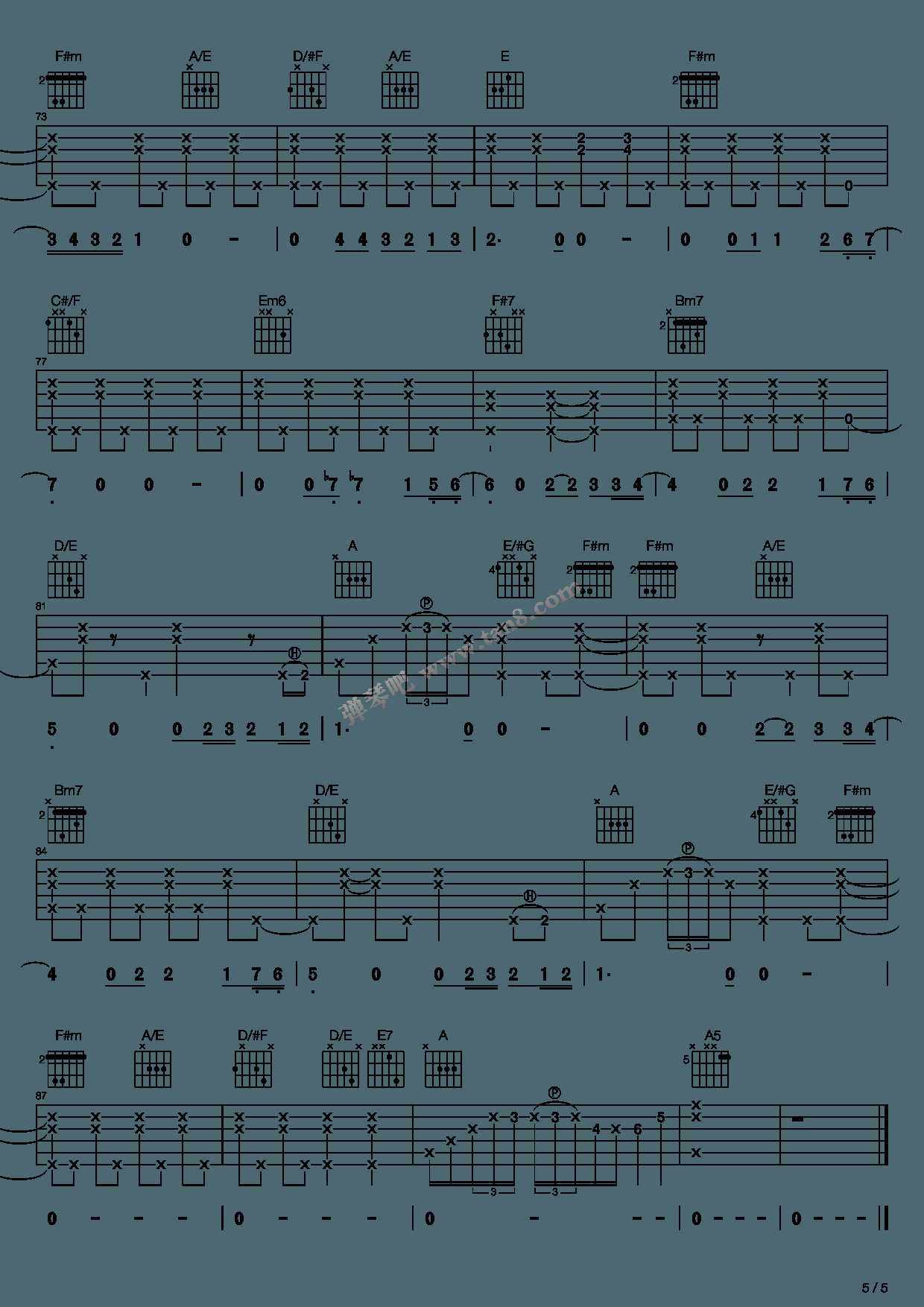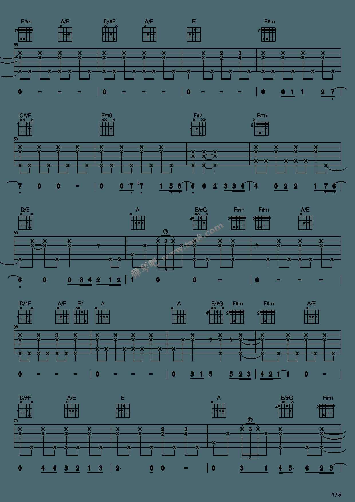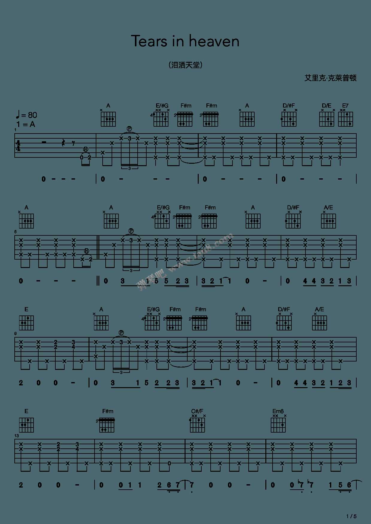 曲谱介绍: Eric-Clapton演唱的一首歌曲,4/4拍的节奏,这首歌曲的原调为A调,这里曲谱采用了A调指法进行编配,演唱时可不夹变调夹,曲谱由琴谱网更新上传,曲谱来源于网络转载,编配制谱者暂不详。这首歌是克莱普顿用他已经被悲痛碾得粉碎的心为纪念他的儿子所作。他是一位平凡的父亲,一个因为失去孩子而频频苛责自己的可怜父亲。