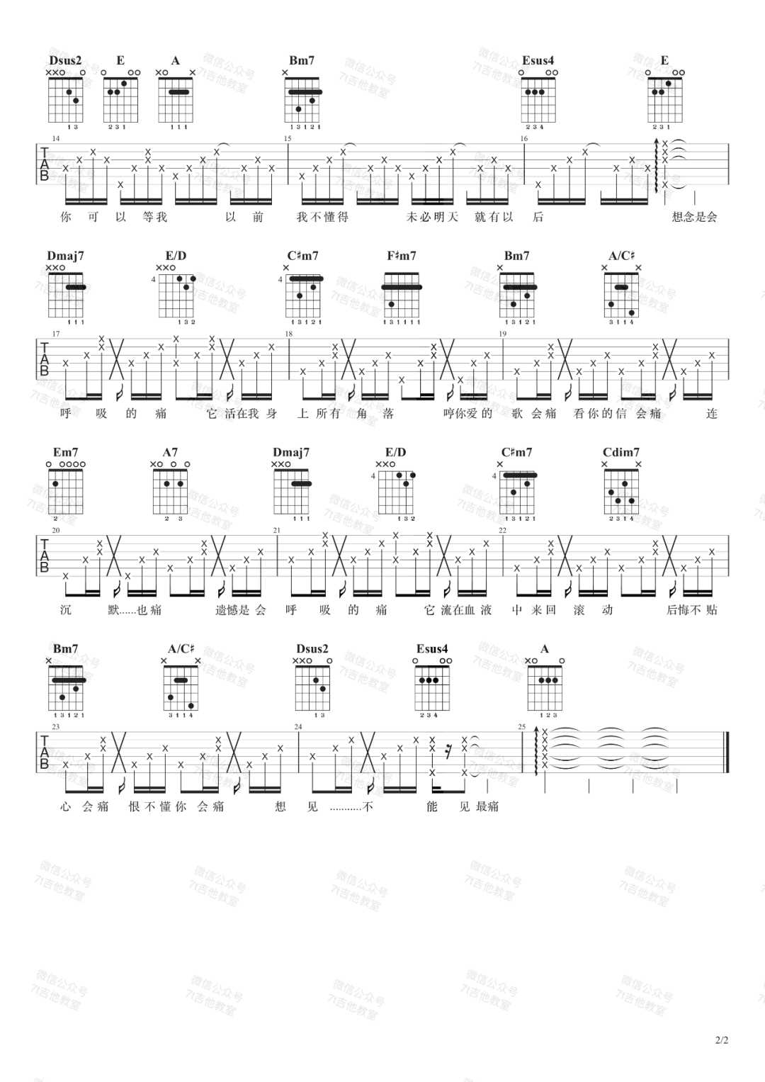 曲谱介绍: 梁静茹演唱的一首歌曲,4/4拍的节奏,这首歌曲的原调为G调,这里曲谱采用了A调指法进行编配,演唱时降全音调弦可回到原调,也可根据个人实际嗓音情况选择不降音或夹几品。曲谱由琴谱网更新上传,来源于@7T吉他教室编配出品。每次听这首歌曲,都会想念一些人,他们可能不在我们身边。或许我们已经和他们失去了联系,但还是阻挡不了情绪的爆发,会呼吸的痛说的应该不是想念,而是失去后才懂得珍惜。