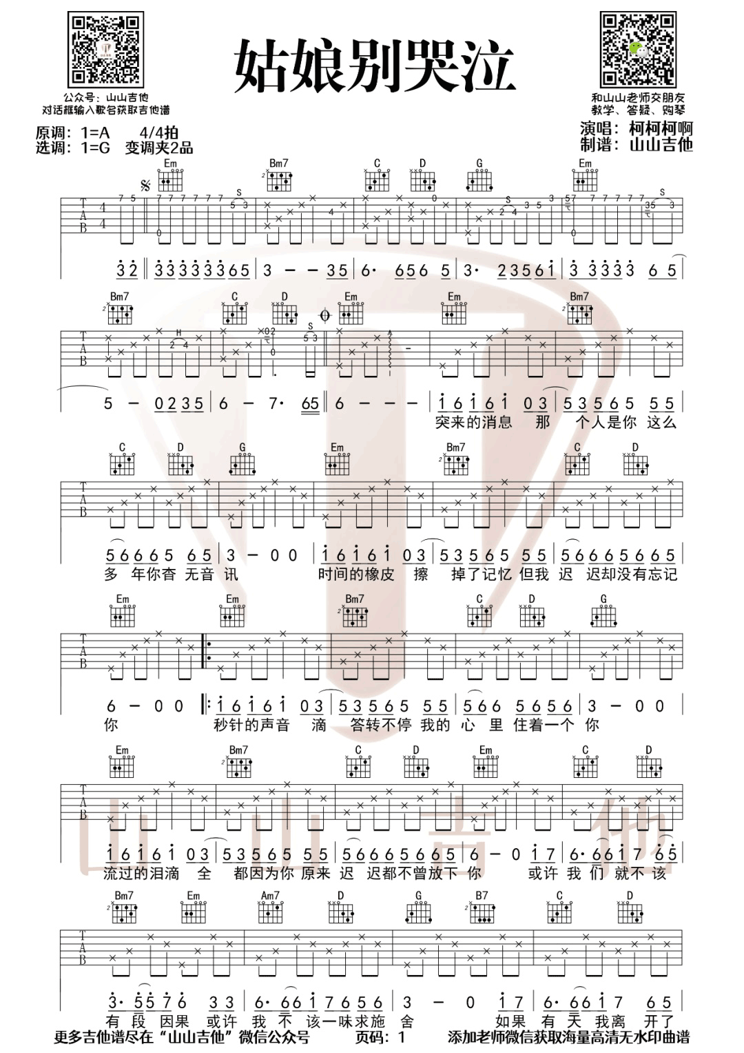 姑娘别哭泣吉他谱 - 柯柯柯啊 - G调吉他弹唱谱