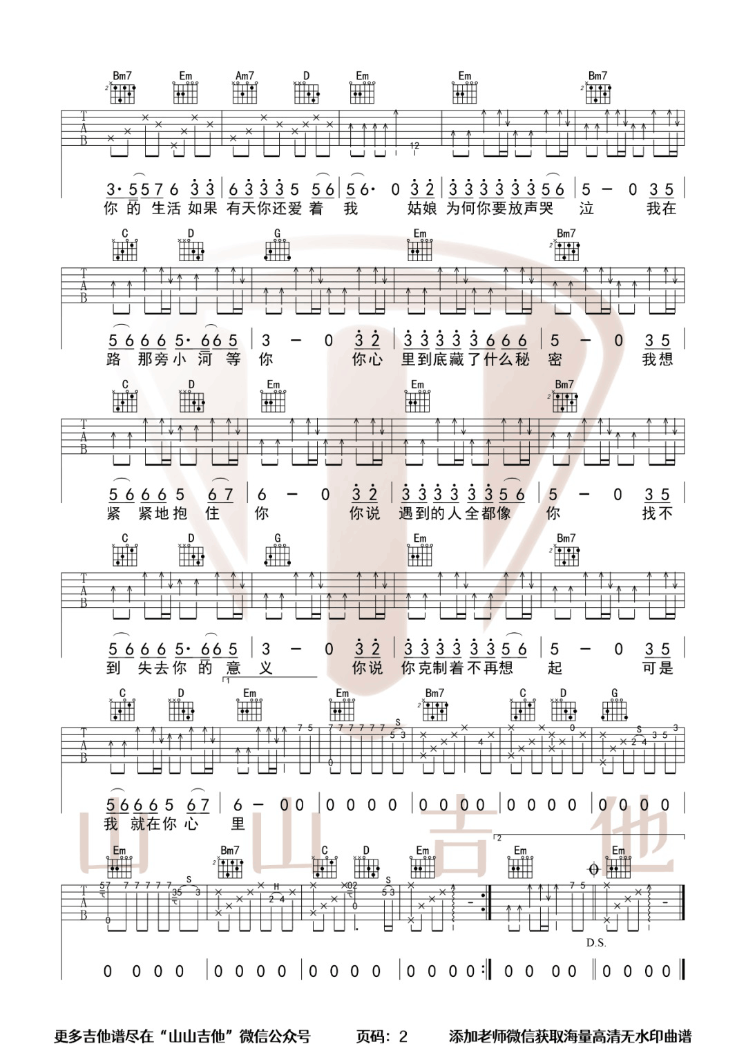 曲谱介绍: 柯柯柯啊演唱的一首歌曲,4/4拍的节奏,这首歌曲的原调为A调,这里曲谱采用了G调指法进行编配,演唱时夹变调夹2品可回到原调,也可根据个人实际嗓音情况选择。曲谱由琴谱网更新上传,来源于@山山吉他编配出品。 你说遇到的人全都像你 找不到失去你的意义 你说你克制着不再想起 可是我就在你心里。