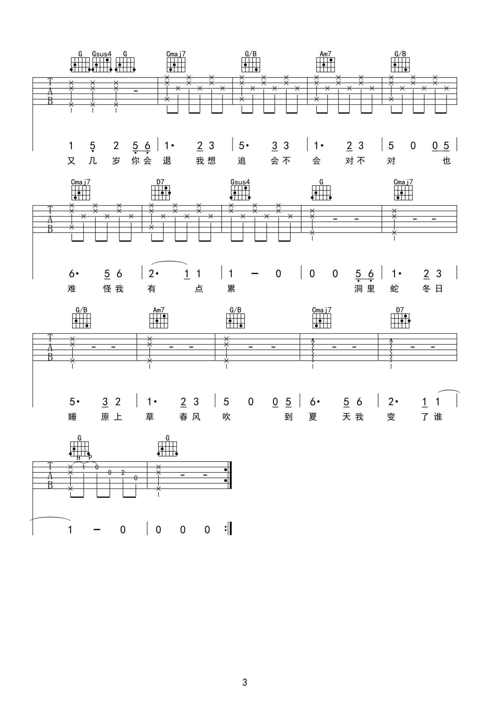 曲谱介绍: 方大同演唱的一首歌曲,3/4拍的节奏,这首歌曲的原调为A调,这里曲谱采用了G调指法进行编配,演唱时夹变调夹2品可回到原调,也可根据个人实际嗓音情况选择。曲谱由琴谱网更新上传,曲谱来源于网络转载,编配制谱者暂不详。方大同是华语乐坛非常罕见的Soul/R&B风格的歌手,这首歌歌词就给人一种温暖的感觉,歌词中描绘了很多春天的景色,加上大同的唱功,所表达的情感刚好跟歌名呼应。