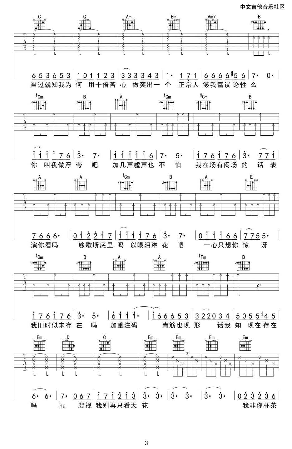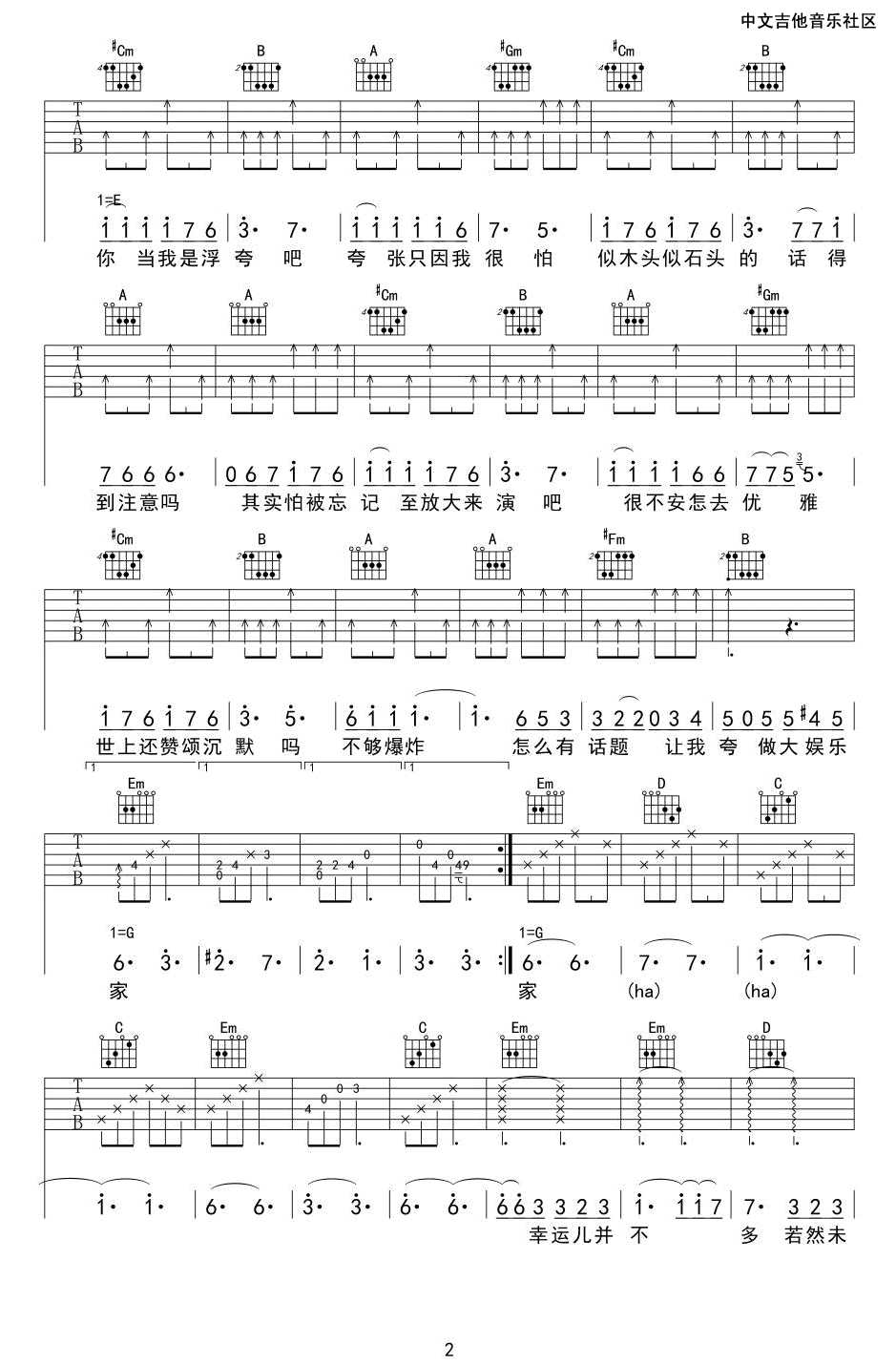 曲谱介绍: 陈奕迅演唱的一首歌曲,6/8拍的节奏,这首歌曲的原调为G调,这里曲谱采用了G调指法进行编配,演唱时可不夹变调夹,曲谱由琴谱网更新上传,曲谱来源于网络转载,编配制谱者暂不详。歌曲虽然用了一些比较不一样的风格来唱这一首歌,给人一种玩世不恭的感觉,可是如果你仔细看歌词,然后把自己代入那个语境就会发现这首歌其实是用一种浮夸的语气去表现自己内心真正的想法。