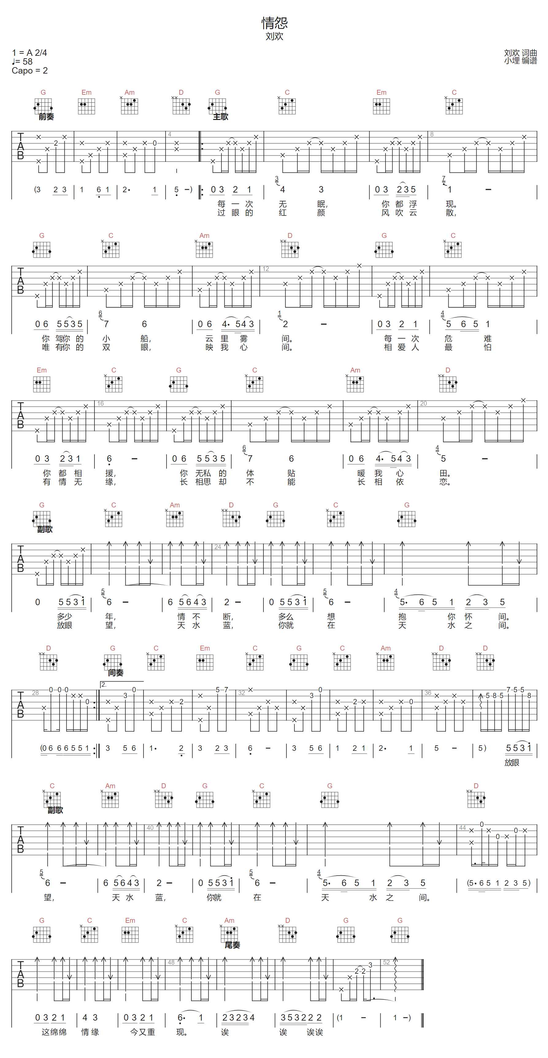 情怨吉他谱 - 刘欢 - G调吉他弹唱谱