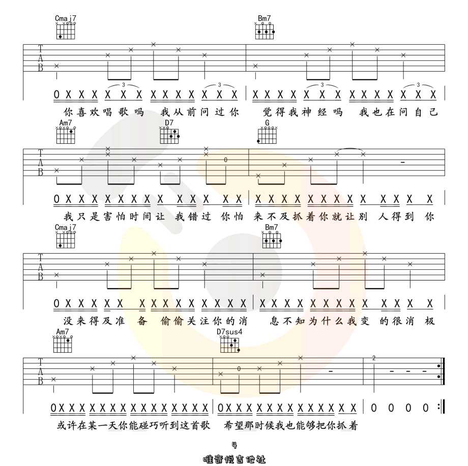 曲谱介绍: 吴海啸演唱的一首歌曲,4/4拍的节奏,这首歌曲的原调为降B调,这里曲谱采用了G调指法进行编配,演唱时夹变调夹3品可回到原调,也可根据个人实际嗓音情况选择。曲谱由琴谱网更新上传,来源于@唯音悦编配出品。这首歌能不能唱进你的心里,温暖到你,以后我想唱给你听。缱绻的词低低吟唱,似诉说着我们的心事,歌声在我们心中溅起涟漪!