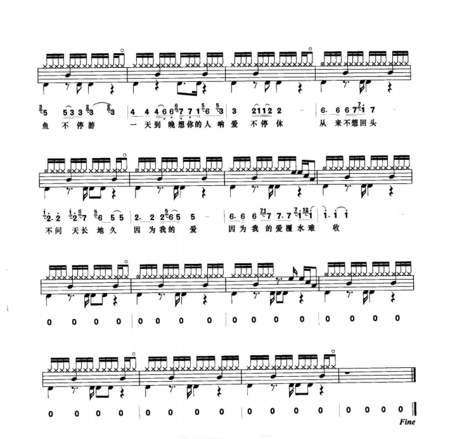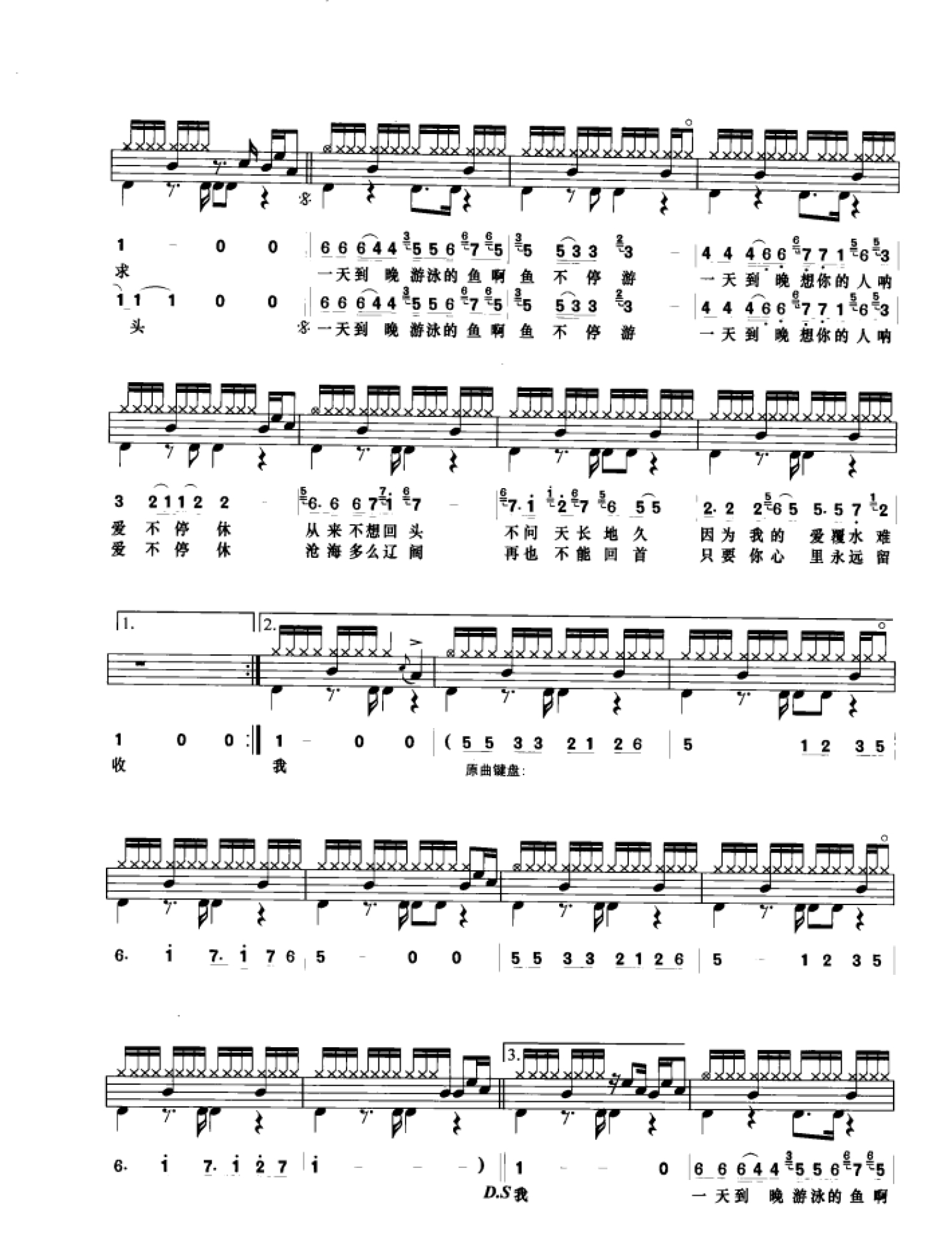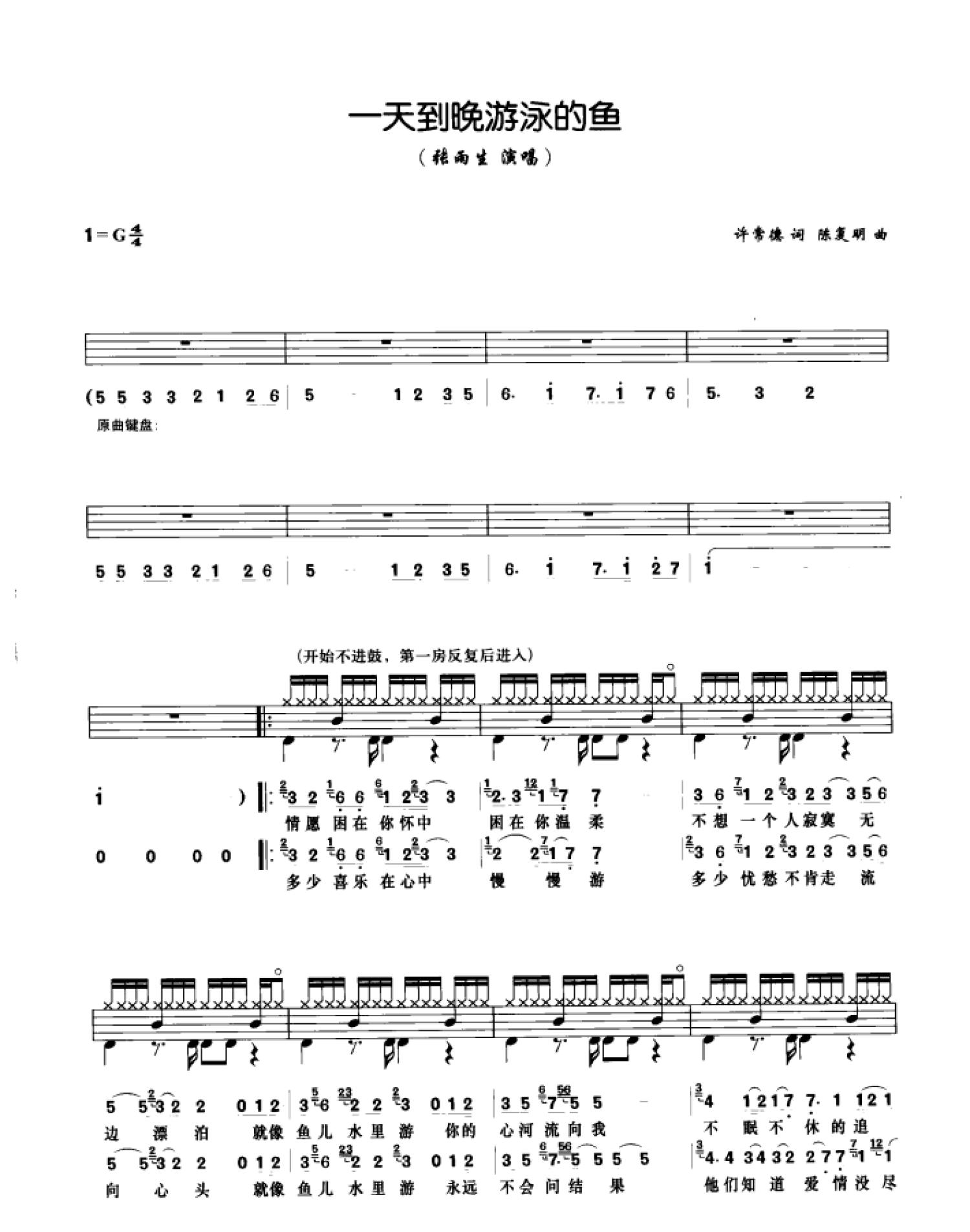 曲谱介绍: 一天到晚游泳的鱼(架子鼓谱)-张雨生