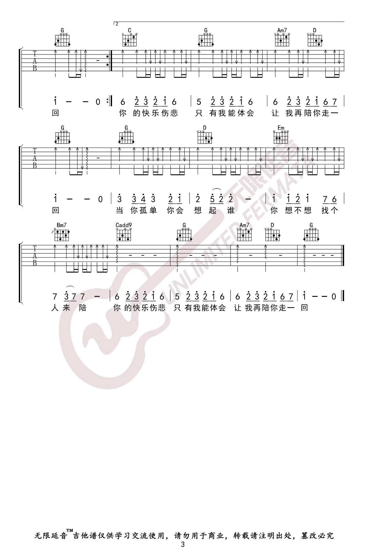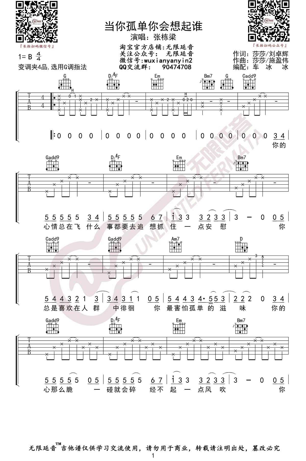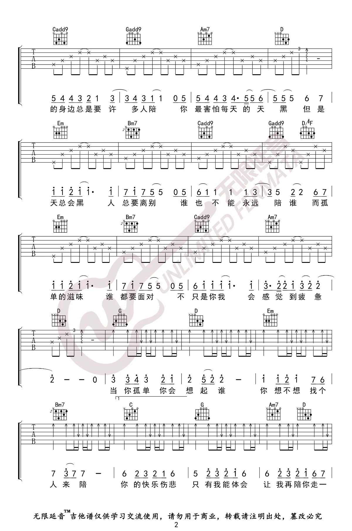 曲谱介绍: 张栋梁演唱的一首歌曲,4/4拍的节奏,这首歌曲的原调为B调,这里曲谱采用了G调指法进行编配,演唱时夹变调夹4品可回到原调,也可根据个人实际嗓音情况选择。曲谱由琴谱网更新上传,来源于@无限延音编配出品。天总是会黑的,人也总要离别,谁也不可能永远陪着谁,孤单的滋味,每个人都要面对,不只是你我。