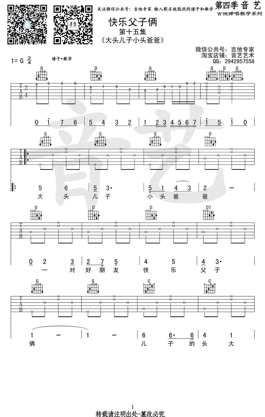 曲谱介绍: 2/4拍的节奏,这首歌曲的原调为G调,这里曲谱采用了G调指法进行编配,演唱时可不夹变调夹,曲谱由琴谱网更新上传,来源于@吉他专家编配出品。是动画片《大头儿子小头爸爸》的主题曲,大头儿子、小头爸爸、围裙妈妈是一个三口之家,他们是中国现代家庭教育典型的缩影。这是一个普通而又平凡的家庭,但它所具有的特质是任何一个家庭都不具备的