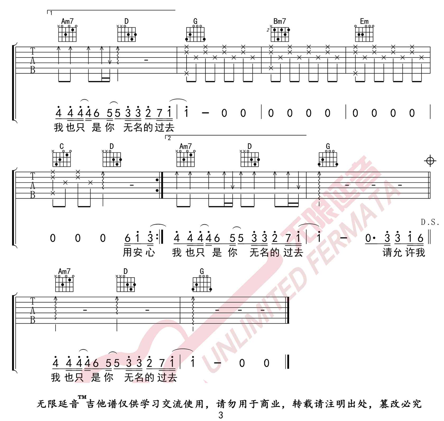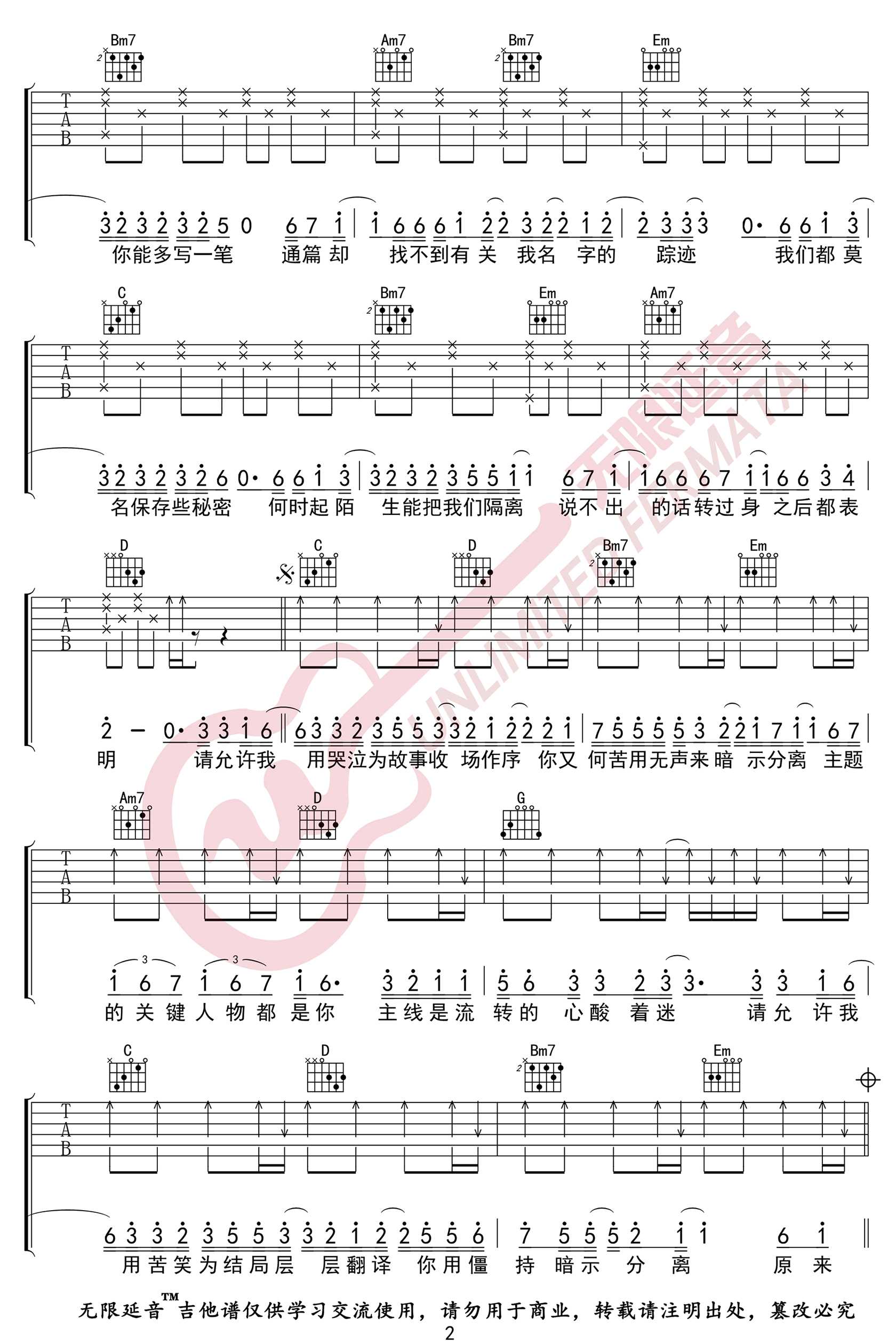 曲谱介绍: en演唱的一首歌曲,4/4拍的节奏,这首歌曲的原调为A调,这里曲谱采用了G调指法进行编配,演唱时夹变调夹2品可回到原调,也可根据个人实际嗓音情况选择。曲谱由琴谱网更新上传,来源于@无限延音编配出品。这首歌的歌词让人非常扎心:请允许我用哭泣为故事收场作序,你又何苦用无声来暗示分离,主题的关键人物都是你,主线是流转的心酸着迷。