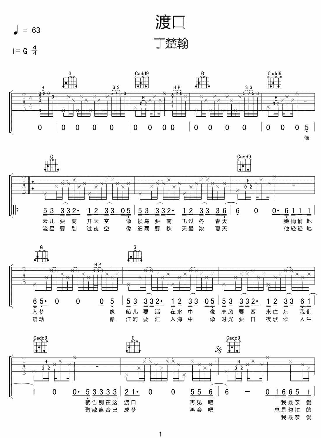 渡口吉他谱 - 丁楚瀚 - G调吉他弹唱谱 - 原版