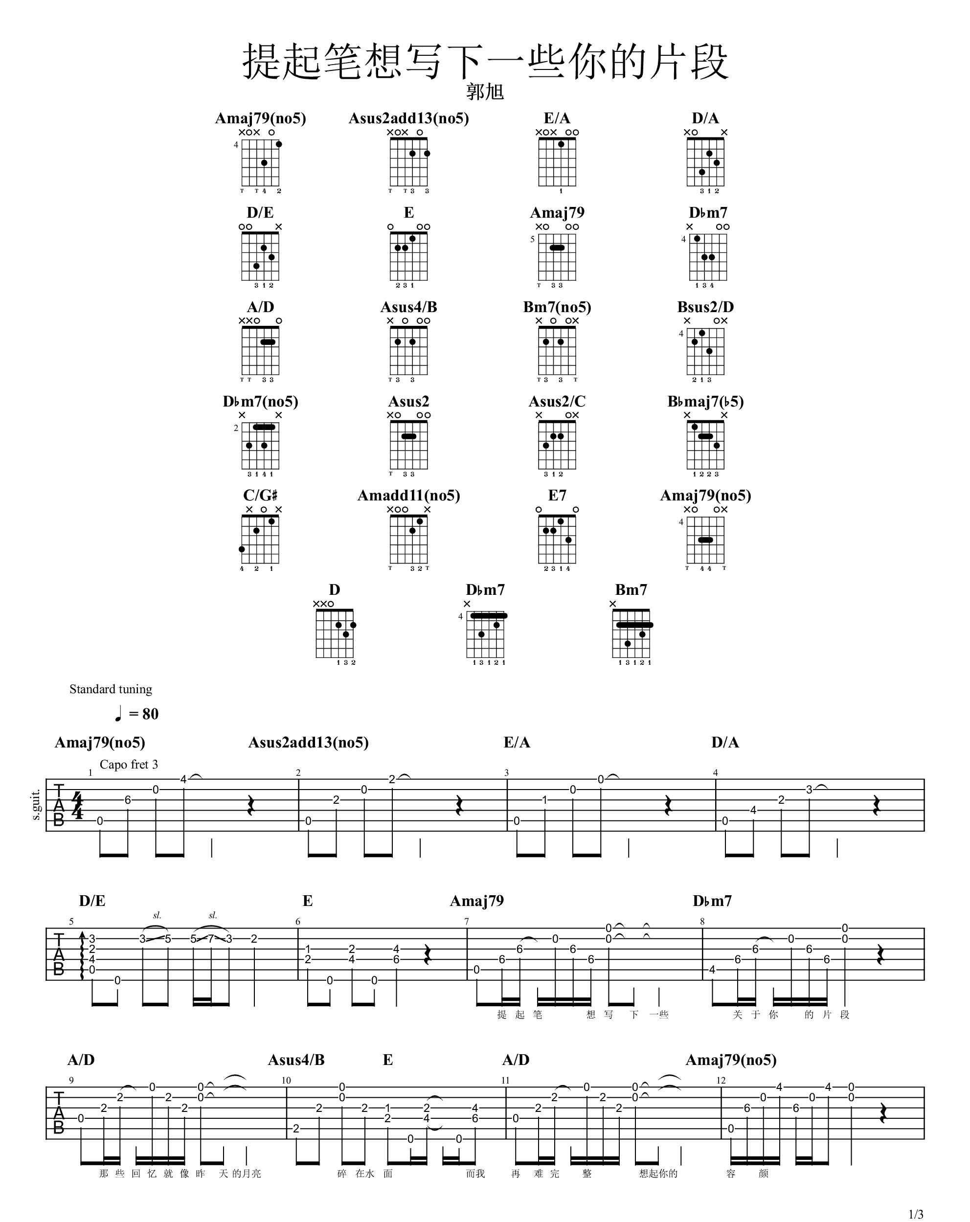 曲谱介绍: 郭旭演唱的一首歌曲,4/4拍的节奏,这首歌曲的原调为C调,这里曲谱采用了A调指法进行编配,演唱时夹变调夹3品可回到原调,也可根据个人实际嗓音情况选择。曲谱由琴谱网更新上传,曲谱来源于网络转载,编配制谱者暂不详。这首歌的歌词非常有创意,通过描述一些与这个人相关的片段,让人们能够更深刻地感受到主角对这个人的思念和爱意。
