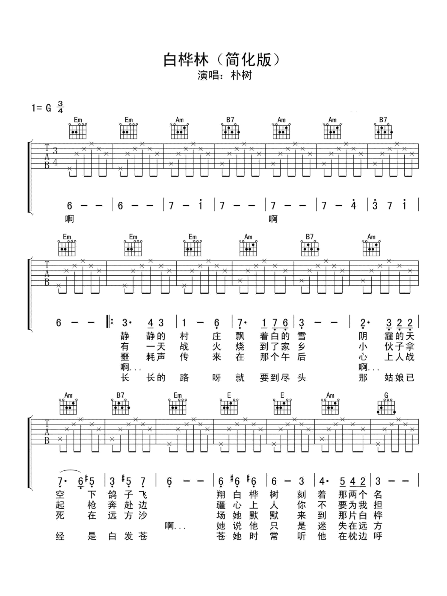 白桦林吉他谱 - 朴树 - G调吉他弹唱谱